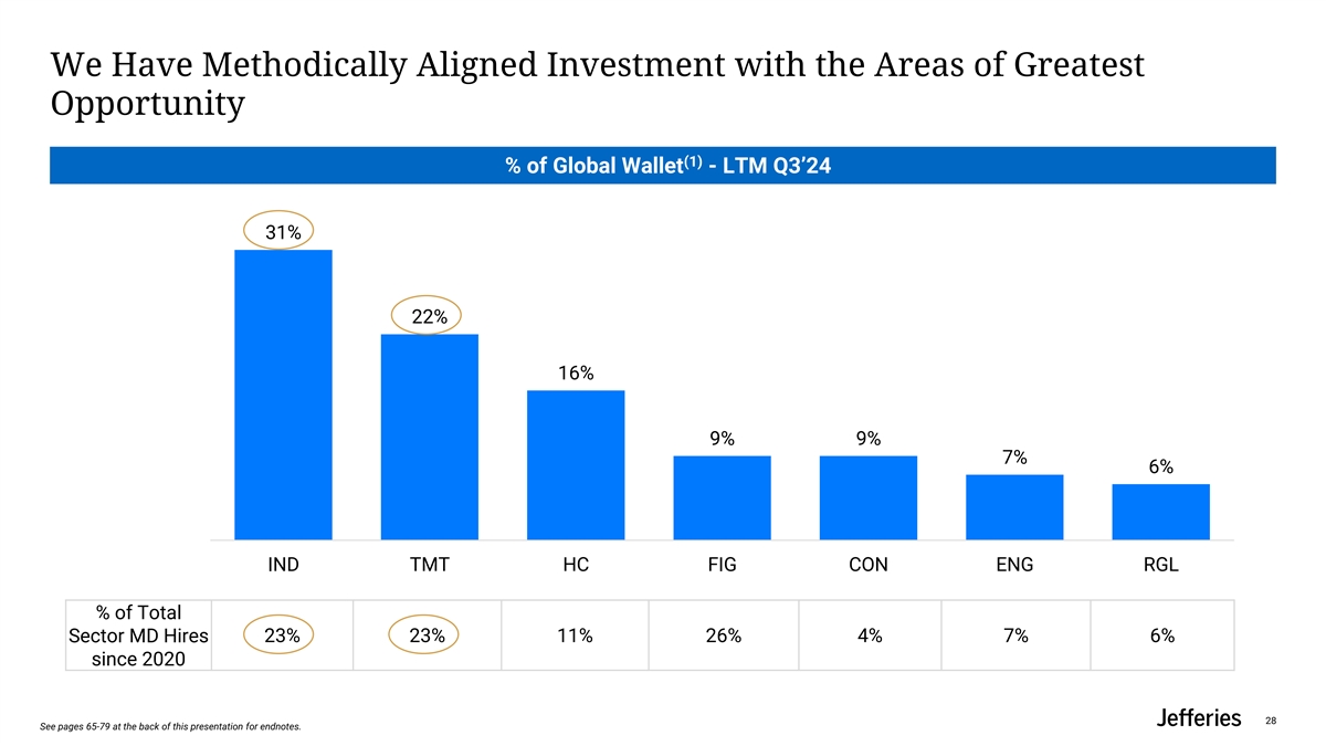 We Have Methodically Aligned Investment with the Areas of Greatest Opportunity (1) % of Global Wallet - ’ 31% 22% 16% 9% 9% 7% 6% IND TMT HC FIG CON ENG RGL % of Total Sector MD Hires 23% 23% 11% 26% 4% 7% 6% since 2020 28 See pages 65-79 at the back of this presentation for endnotes.