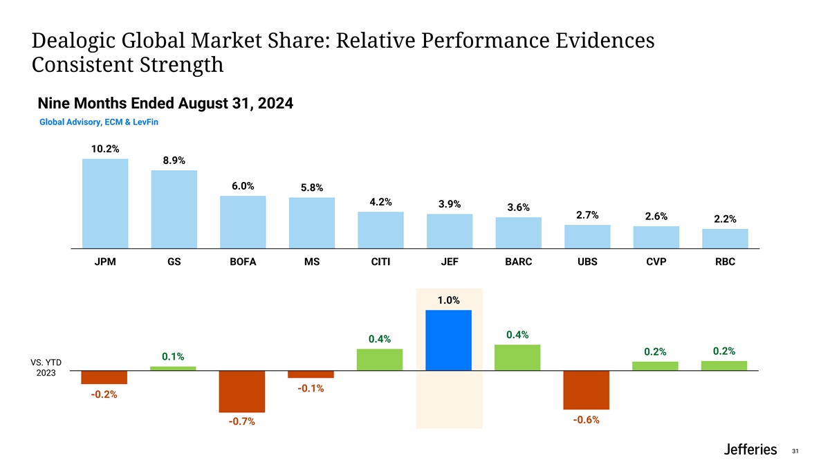 Dealogic Global Market Share: Relative Performance Evidences Consistent Strength Nine Months Ended August 31, 2024 Global Advisory, ECM & LevFin 10.2% 8.9% 6.0% 5.8% 4.2% 3.9% 3.6% 2.7% 2.6% 2.2% JPM GS BOFA MS CITI JEF BARC UBS CVP RBC 1.0% 0.4% 0.4% 0.2% 0.2% 0.1% VS. YTD 2023 -0.1% -0.2% -0.6% -0.7% 31