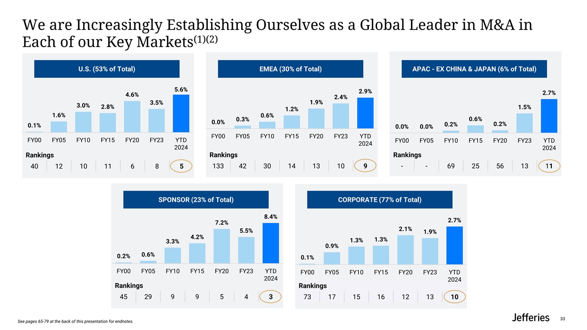 We are Increasingly Establishing Ourselves as a Global Leader in M&A in (1)(2) Each of our Key Markets U.S. (53% of Total) EMEA (30% of Total) APAC - EX CHINA & JAPAN (6% of Total) 5.6% 2.9% 2.7% 4.6% 2.4% 1.9% 3.5% 3.0% 2.8% 1.5% 1.2% 1.6% 0.6% 0.6% 0.3% 0.0% 0.2% 0.2% 0.1% 0.0% 0.0% FY00 FY05 FY10 FY15 FY20 FY23 YTD FY00 FY05 FY10 FY15 FY20 FY23 YTD FY00 FY05 FY10 FY15 FY20 FY23 YTD 2024 2024 2024 Rankings Rankings Rankings 40 12 10 11 6 8 5 133 42 30 14 13 10 9 - - 69 25 56 13 11 SPONSOR (23% of Total) CORPORATE (77% of Total) 8.4% 2.7% 7.2% 2.1% 5.5% 1.9% 4.2% 1.3% 1.3% 3.3% 0.9% 0.6% 0.2% 0.1% FY00 FY05 FY10 FY15 FY20 FY23 YTD FY00 FY05 FY10 FY15 FY20 FY23 YTD 2024 2024 Rankings Rankings 45 29 9 9 5 4 3 73 17 15 16 12 13 10 33 See pages 65-79 at the back of this presentation for endnotes.
