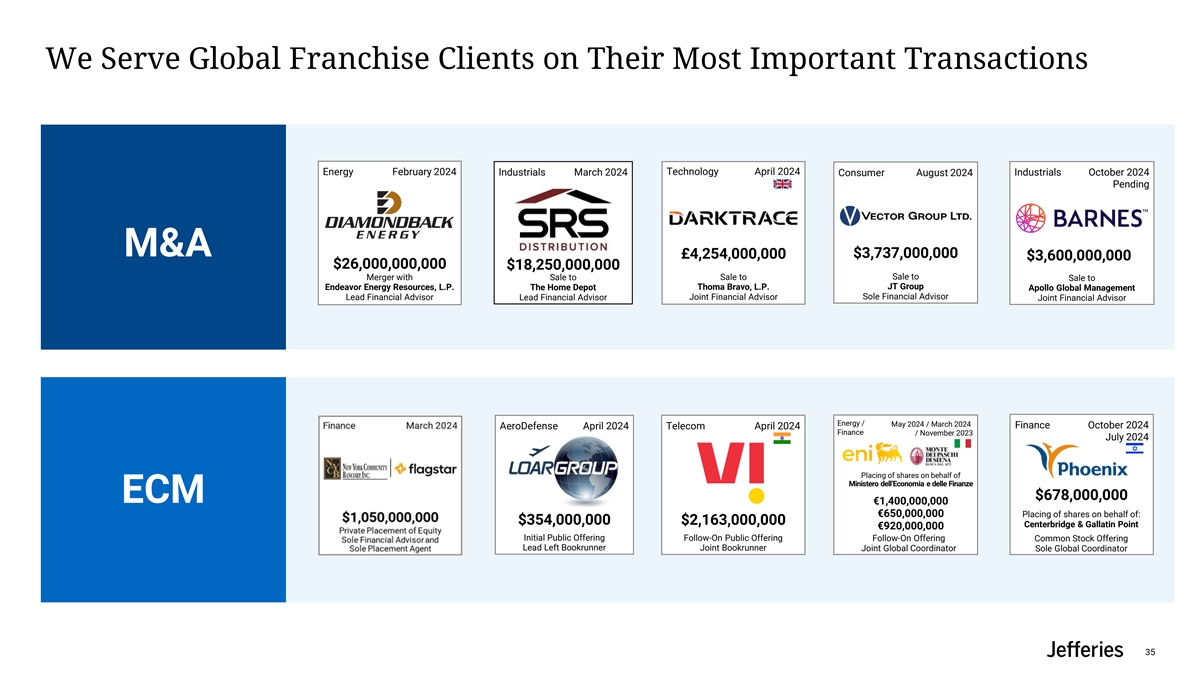 We Serve Global Franchise Clients on Their Most Important Transactions Energy February 2024 Technology April 2024 Industrials March 2024 Consumer August 2024 Industrials October 2024 Pending M&A £4,254,000,000 $3,737,000,000 $3,600,000,000 $26,000,000,000 $18,250,000,000 Merger with Sale to Sale to Sale to Sale to Endeavor Energy Resources, L.P. The Home Depot Thoma Bravo, L.P. JT Group Apollo Global Management Lead Financial Advisor Lead Financial Advisor Joint Financial Advisor Sole Financial Advisor Joint Financial Advisor Energy / May 2024 / March 2024 Finance October 2024 AeroDefense April 2024 Telecom April 2024 Finance / November 2023 July 2024 Placing of shares on behalf of inistero dell’Economia e delle Finanze $678,000,000 ECM € , , , €65 , , Placing of shares on behalf of: $354,000,000 $2,163,000,000 Centerbridge & Gallatin Point € , , Initial Public Offering Follow-On Public Offering Follow-On Offering Common Stock Offering Lead Left Bookrunner Joint Bookrunner Joint Global Coordinator Sole Global Coordinator 35