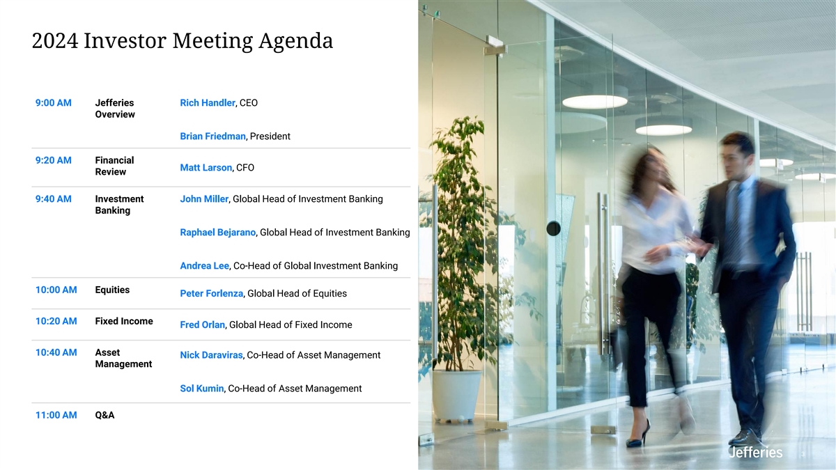 2024 Investor Meeting Agenda 9:00 AM Jefferies Rich Handler, CEO Overview Brian Friedman, President 9:20 AM Financial Matt Larson, CFO Review 9:40 AM Investment John Miller, Global Head of Investment Banking Banking Raphael Bejarano, Global Head of Investment Banking Andrea Lee, Co-Head of Global Investment Banking 10:00 AM Equities Peter Forlenza, Global Head of Equities 10:20 AM Fixed Income Fred Orlan, Global Head of Fixed Income 10:40 AM Asset Nick Daraviras, Co-Head of Asset Management Management Sol Kumin, Co-Head of Asset Management 11:00 AM Q&A 3