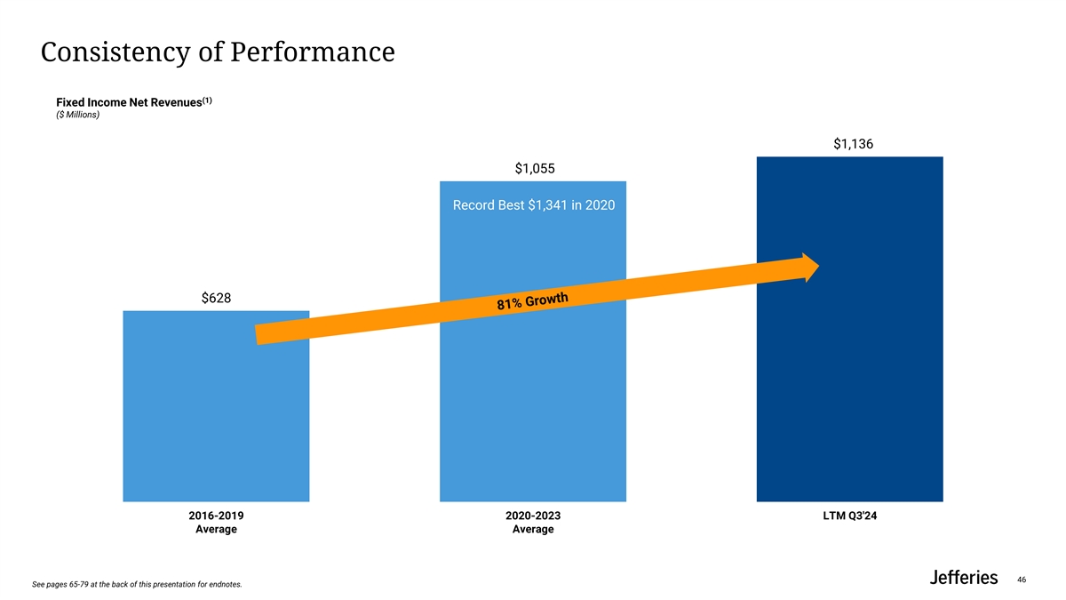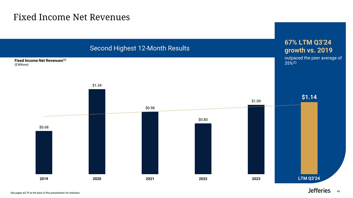 Fixed Income Net Revenues 67% ’ Second Highest 12-Month Results growth vs. 2019 outpaced the peer average of (1) Fixed Income Net Revenues (2) 35% ($ Billions) $1.34 $1.14 $1.09 $0.98 $0.80 $0.68 2019 2020 2021 2022 2023 LTM Q 3'2’ 4 45 See pages 65-79 at the back of this presentation for endnotes.