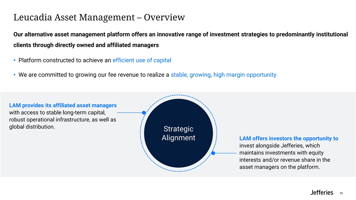 Leucadia Asset Management – Overview Our alternative asset management platform offers an innovative range of investment strategies to predominantly institutional clients through directly owned and affiliated managers • Platform constructed to achieve an efficient use of capital • We are committed to growing our fee revenue to realize a stable, growing, high margin opportunity LAM provides its affiliated asset managers with access to stable long-term capital, robust operational infrastructure, as well as global distribution. Strategic Alignment LAM offers investors the opportunity to invest alongside Jefferies, which maintains investments with equity interests and/or revenue share in the asset managers on the platform. 55