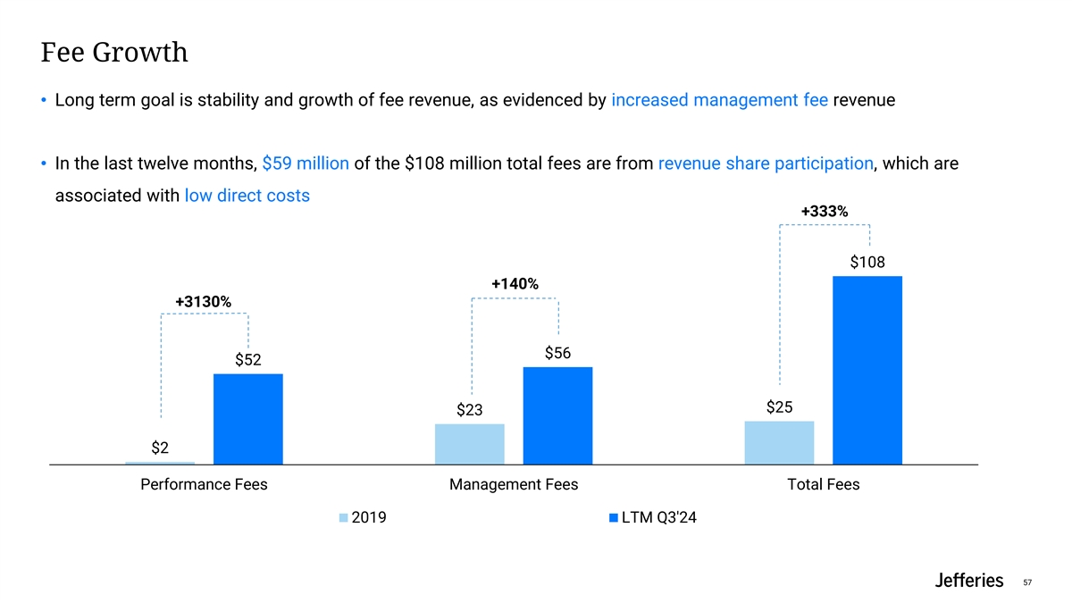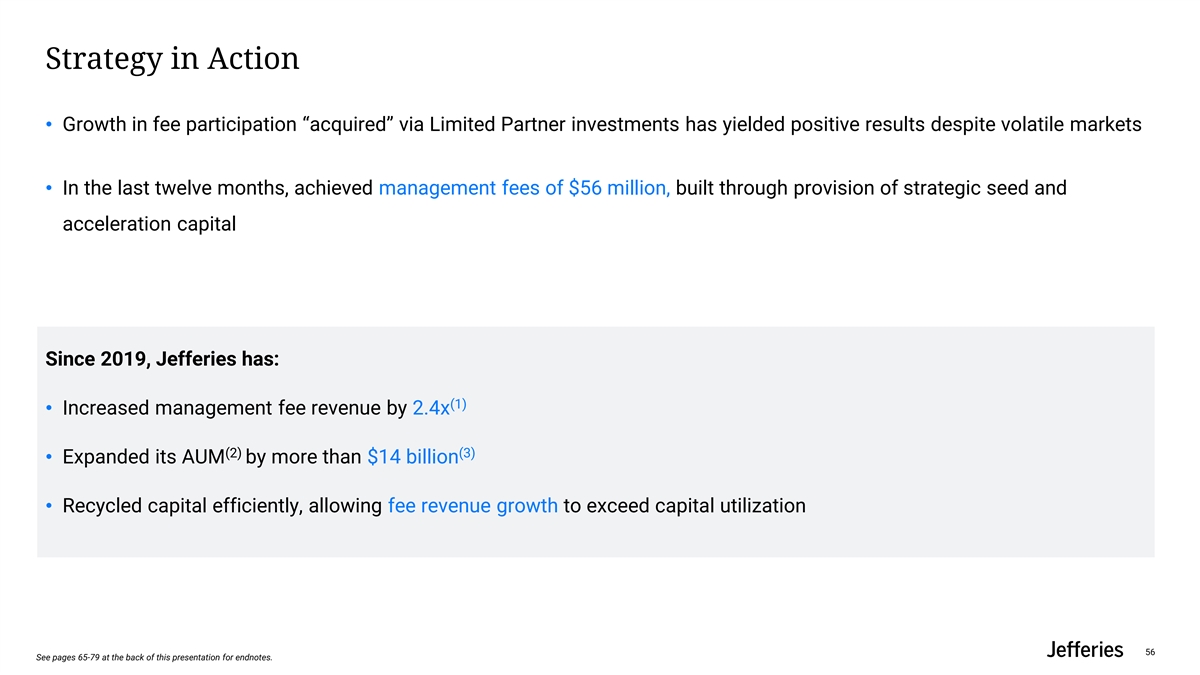 Strategy in Action • Growth in fee participation “acquired” via Limited Partner investments has yielded positive results despite volatile markets • In the last twelve months, achieved management fees of $56 million, built through provision of strategic seed and acceleration capital Since 2019, Jefferies has: (1) • Increased management fee revenue by 2.4x (2) (3) • Expanded its AUM by more than $14 billion • Recycled capital efficiently, allowing fee revenue growth to exceed capital utilization 56 See pages 65-79 at the back of this presentation for endnotes.
