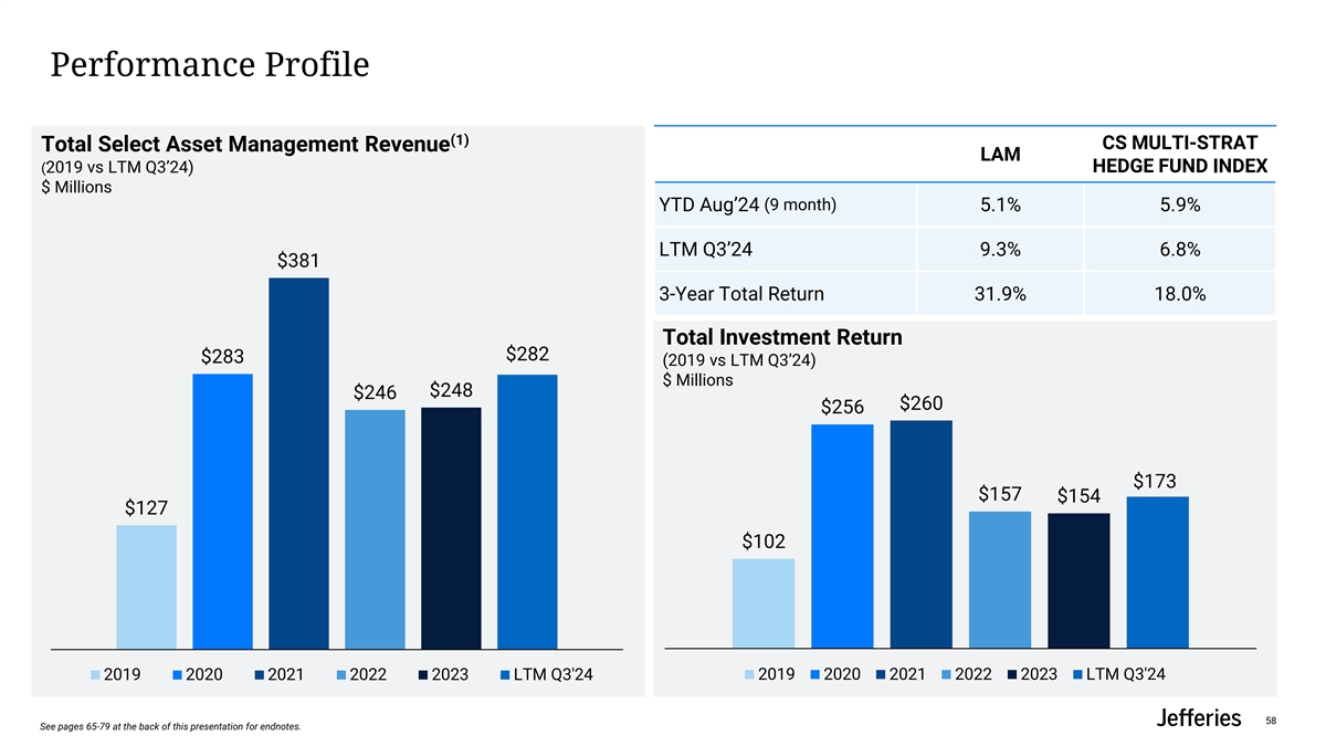 Performance Profile (1) CS MULTI-STRAT Total Select Asset Management Revenue LAM (2019 vs LTM Q3’24) HEDGE FUND INDEX $ Millions (9 month) YTD Aug’24 5.1% 5.9% LTM Q3’24 9.3% 6.8% $381 3-Year Total Return 31.9% 18.0% Total Investment Return $282 $283 (2019 vs LTM Q3’24) $ Millions $248 $246 $260 $256 $173 $157 $154 $127 $102 2019 2020 2021 2022 2023 LTM Q3'24 2019 2020 2021 2022 2023 LTM Q3'24 58 See pages 65-79 at the back of this presentation for endnotes.