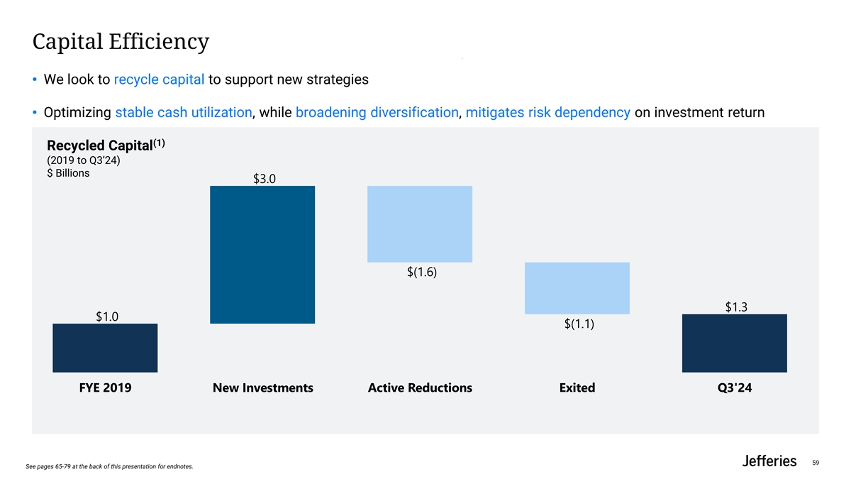 Capital Efficiency • We look to recycle capital to support new strategies • Optimizing stable cash utilization, while broadening diversification, mitigates risk dependency on investment return (1) Recycled Capital (2019 to Q3’24) $ Billions 59 See pages 65-79 at the back of this presentation for endnotes.