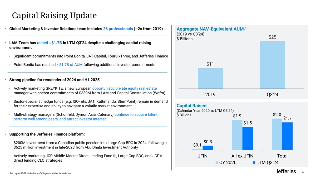 Capital Raising Update (1) • Global Marketing & Investor Relations team includes 26 professionals (~2x from 2019) Aggregate NAV-Equivalent AUM (2019 vs Q3’24) $25 $ Billions • LAM Team has raised ~$1.7B in ’ despite a challenging capital raising environment • Significant commitments into Point Bonita, JAT Capital, FourSixThree, and Jefferies Finance $11 • Point Bonita has reached ~$1.7B of AUM following additional investor commitments • Strong pipeline for remainder of 2024 and H1 2025 • Actively marketing GREYKITE, a new European opportunistic private equity real estate manager with anchor commitments of $330M from LAM and Capital Constellation (Wafra) 2019 Q3'24 • Sector-specialist hedge funds (e.g. ISO-mts, JAT, Kathmandu, StemPoint) remain in demand for their expertise and ability to navigate a volatile market environment Capital Raised (Calendar Year 2020 vs LTM Q3’24) • Multi-strategy managers (Schonfeld, Dymon Asia, Catenary) continue to acquire talent, $2.0 $ Billions $1.9 $1.7 perform well among peers, and attract investor interest $1.5 • Supporting the Jefferies Finance platform: $0.3 • $200M investment from a Canadian public pension into Large-Cap BDC in 2024, following a $0.1 $625 million investment in late-2023 from Abu Dhabi Investment Authority • Actively marketing JCP Middle Market Direct Lending Fund III, Large-Cap BDC, and JCP’s JFIN All ex-JFIN Total direct lending CLO strategies CY 2020 LTM Q3'24 60 See pages 65-79 at the back of this presentation for endnotes.