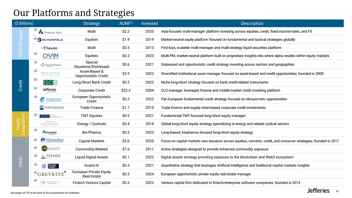 Our Platforms and Strategies (1) ($ Billions) Strategy AUM Invested Description (2) Multi $2.2 2020 Asia-focused multi-manager platform investing across equities, credit, fixed income/rates, and FX (2) Equities $1.9 2019 Market-neutral equity platform focused on fundamental and tactical strategies globally Multi $0.5 2013 First-loss, scalable multi-manager and multi-strategy liquid securities platform (2) Equities $0.2 2023 Multi-PM, market-neutral platform built on proprietary insights into where alpha resides within equity markets (2) Special $0.6 2021 Distressed and opportunistic credit strategy investing across sectors and geographies Situations/Distressed (2) Asset-Based & $3.9 2022 Diversified institutional asset manager focused on asset-based and credit opportunities; founded in 2008 Opportunistic Credit (2) Long/Short Bank Credit $0.3 2022 Niche long/short strategy focused on bank credit-related instruments (5) Corporate Credit $22.3 2004 CLO manager, leveraged finance and middle-market credit investing platform (2) European Opportunistic $0.2 2022 Pan-European fundamental credit strategy focused on idiosyncratic opportunities Credit Trade Finance $1.7 2019 Trade finance and supply chain-based corporate credit investments (2) TMT Equities $0.9 2021 Fundamental TMT-focused long/short equity manager Energy / Cyclicals $0.4 2018 Global long/short equity strategy specializing in energy and related cyclical sectors (2) Bio-Pharma $0.3 2023 Long-biased, biopharma focused long/short equity strategy (3) Capital Markets $2.0 2020 Focus on capital markets new issuance across equities, converts, credit, and crossover strategies; founded in 2011 (4) Commodity-Related $7.6 2011 Active strategies designed to provide enhanced commodity exposure (2) Liquid Digital Assets $0.1 2022 Digital assets strategy providing exposure to the blockchain and Web3 ecosystem (2) Quant/AI $0.3 2021 Quantitative strategy that leverages Artificial Intelligence and traditional capital markets insights European Private Equity (4) * $0.3 2024 European opportunistic private equity real estate manager Real Estate (4) Fintech Venture Capital $0.3 2022 Venture capital firm dedicated to fintech/enterprise software companies; founded in 2014 61 See pages 65-79 at the back of this presentation for endnotes. Equity Other Credit Multi-Manager Long/Short