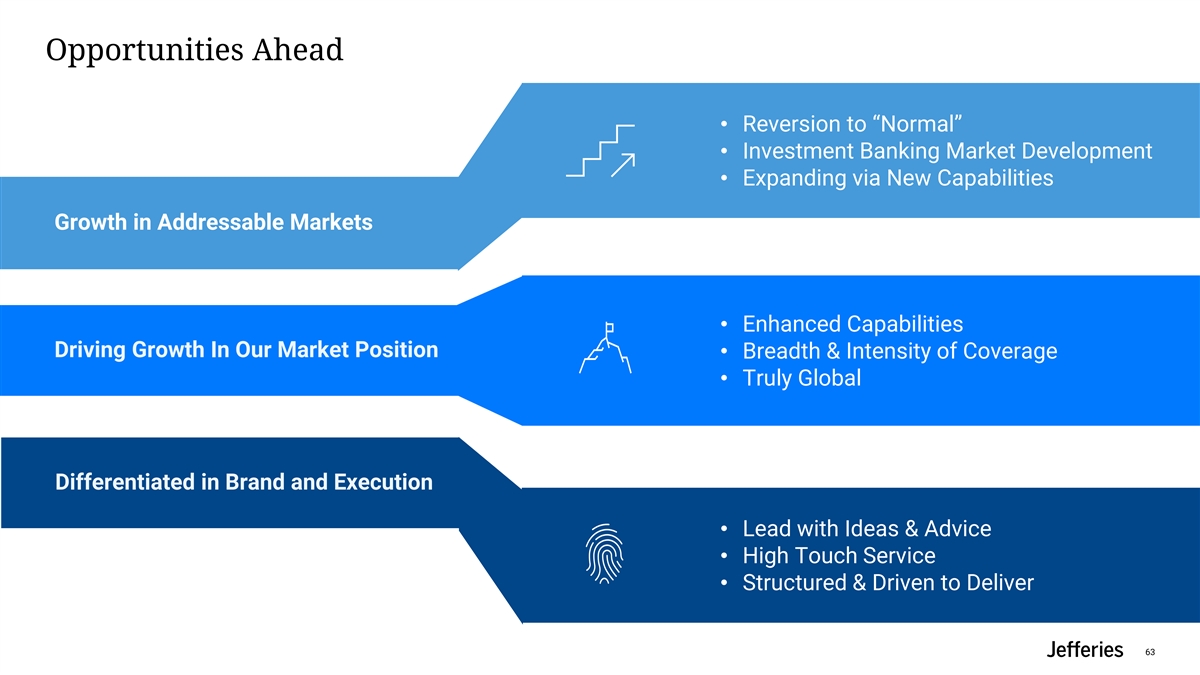 Opportunities Ahead • Reversion to “Normal” • Investment Banking Market Development • Expanding via New Capabilities Growth in Addressable Markets • Enhanced Capabilities Driving Growth In Our Market Position • Breadth & Intensity of Coverage • Truly Global Differentiated in Brand and Execution • Lead with Ideas & Advice • High Touch Service • Structured & Driven to Deliver 63