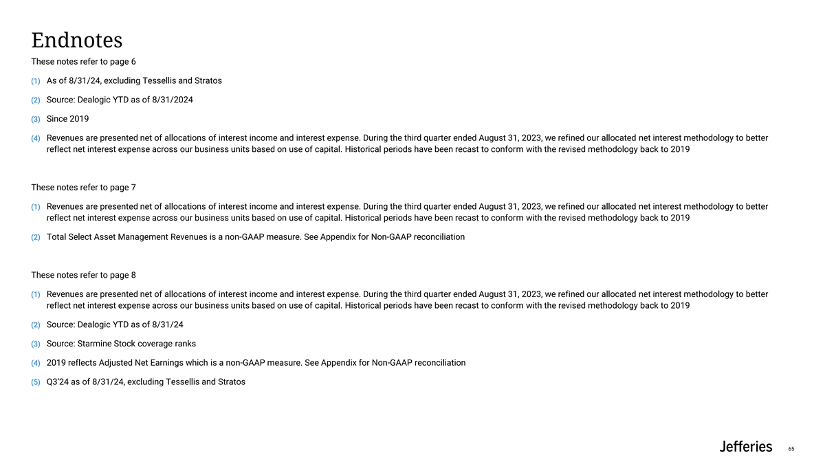 Endnotes These notes refer to page 6 (1) As of 8/31/24, excluding Tessellis and Stratos (2) Source: Dealogic YTD as of 8/31/2024 (3) Since 2019 (4) Revenues are presented net of allocations of interest income and interest expense. During the third quarter ended August 31, 2023, we refined our allocated net interest methodology to better reflect net interest expense across our business units based on use of capital. Historical periods have been recast to conform with the revised methodology back to 2019 These notes refer to page 7 (1) Revenues are presented net of allocations of interest income and interest expense. During the third quarter ended August 31, 2023, we refined our allocated net interest methodology to better reflect net interest expense across our business units based on use of capital. Historical periods have been recast to conform with the revised methodology back to 2019 (2) Total Select Asset Management Revenues is a non-GAAP measure. See Appendix for Non-GAAP reconciliation These notes refer to page 8 (1) Revenues are presented net of allocations of interest income and interest expense. During the third quarter ended August 31, 2023, we refined our allocated net interest methodology to better reflect net interest expense across our business units based on use of capital. Historical periods have been recast to conform with the revised methodology back to 2019 (2) Source: Dealogic YTD as of 8/31/24 (3) Source: Starmine Stock coverage ranks (4) 2019 reflects Adjusted Net Earnings which is a non-GAAP measure. See Appendix for Non-GAAP reconciliation (5) Q3’24 as of 8/31/24, excluding Tessellis and Stratos 65