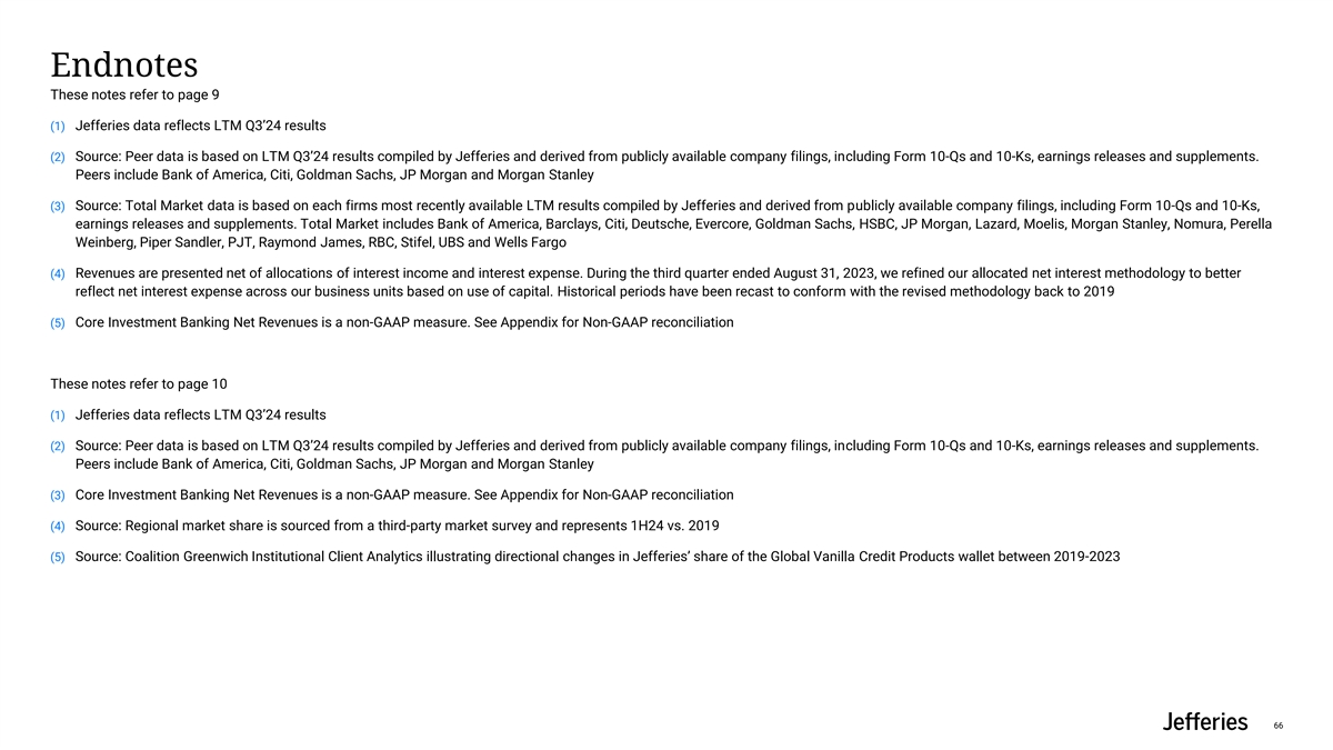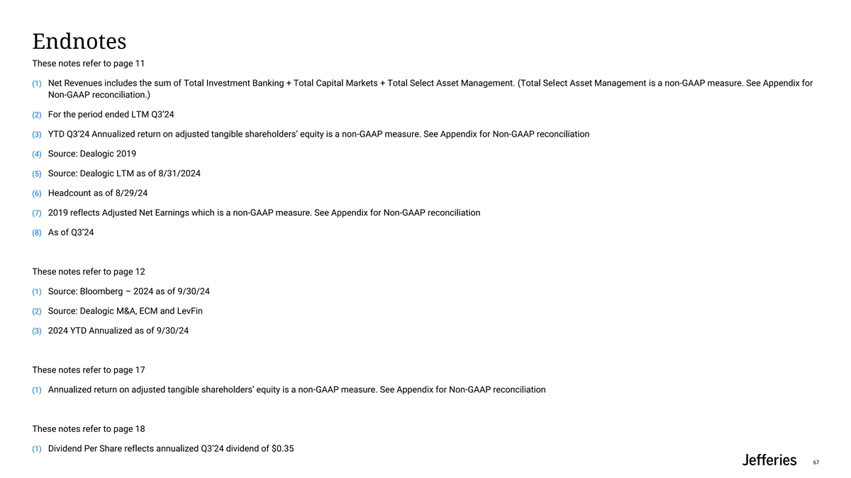 Endnotes These notes refer to page 9 (1) Jefferies data reflects LTM Q3’24 results (2) Source: Peer data is based on LTM Q3’24 results compiled by Jefferies and derived from publicly available company filings, including Form 10-Qs and 10-Ks, earnings releases and supplements. Peers include Bank of America, Citi, Goldman Sachs, JP Morgan and Morgan Stanley (3) Source: Total Market data is based on each firms most recently available LTM results compiled by Jefferies and derived from publicly available company filings, including Form 10-Qs and 10-Ks, earnings releases and supplements. Total Market includes Bank of America, Barclays, Citi, Deutsche, Evercore, Goldman Sachs, HSBC, JP Morgan, Lazard, Moelis, Morgan Stanley, Nomura, Perella Weinberg, Piper Sandler, PJT, Raymond James, RBC, Stifel, UBS and Wells Fargo (4) Revenues are presented net of allocations of interest income and interest expense. During the third quarter ended August 31, 2023, we refined our allocated net interest methodology to better reflect net interest expense across our business units based on use of capital. Historical periods have been recast to conform with the revised methodology back to 2019 (5) Core Investment Banking Net Revenues is a non-GAAP measure. See Appendix for Non-GAAP reconciliation These notes refer to page 10 (1) Jefferies data reflects LTM Q3’24 results (2) Source: Peer data is based on LTM Q3’24 results compiled by Jefferies and derived from publicly available company filings, including Form 10-Qs and 10-Ks, earnings releases and supplements. Peers include Bank of America, Citi, Goldman Sachs, JP Morgan and Morgan Stanley (3) Core Investment Banking Net Revenues is a non-GAAP measure. See Appendix for Non-GAAP reconciliation (4) Source: Regional market share is sourced from a third-party market survey and represents 1H24 vs. 2019 (5) Source: Coalition Greenwich Institutional Client Analytics illustrating directional changes in Jefferies’ share of the Global Vanilla Credit Products wallet between 2019-2023 66