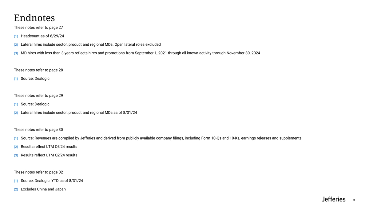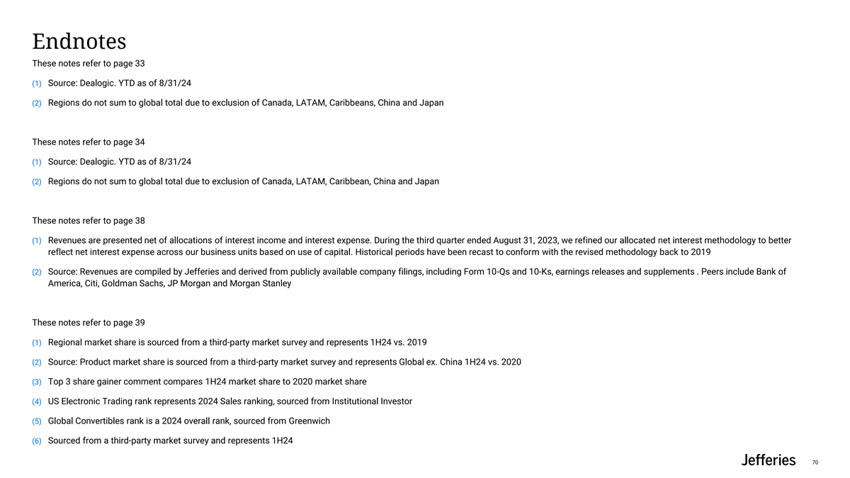 Endnotes These notes refer to page 27 (1) Headcount as of 8/29/24 (2) Lateral hires include sector, product and regional MDs. Open lateral roles excluded (3) MD hires with less than 3 years reflects hires and promotions from September 1, 2021 through all known activity through November 30, 2024 These notes refer to page 28 (1) Source: Dealogic These notes refer to page 29 (1) Source: Dealogic (2) Lateral hires include sector, product and regional MDs as of 8/31/24 These notes refer to page 30 (1) Source: Revenues are compiled by Jefferies and derived from publicly available company filings, including Form 10-Qs and 10-Ks, earnings releases and supplements (2) Results reflect LTM Q3’24 results (3) Results reflect LTM Q2’24 results These notes refer to page 32 (1) Source: Dealogic. YTD as of 8/31/24 (2) Excludes China and Japan 69