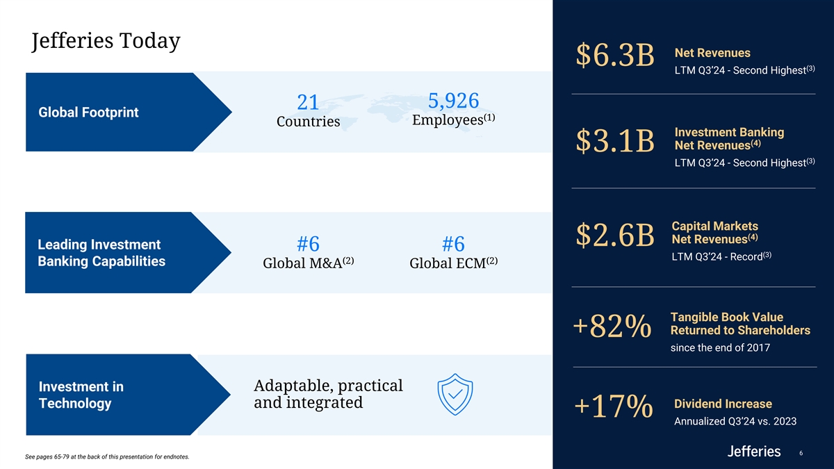 T H E J E F F E R I E S D I F F E R E N C E Relentless Differentiated A Flat and Nimble Client Focus Insights Operating Structure J E F F E R I E S I S A W O R L D L E A D I N G F U L L S E R V I C E I N V E S T M E N T B A N K I N G A N D C A P I T A L M A R K E T S F I R M 5