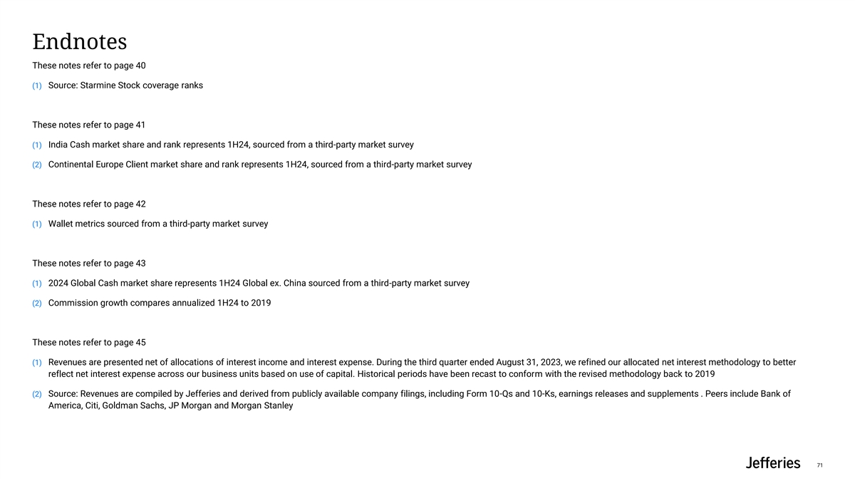 Endnotes These notes refer to page 40 (1) Source: Starmine Stock coverage ranks These notes refer to page 41 (1) India Cash market share and rank represents 1H24, sourced from a third-party market survey (2) Continental Europe Client market share and rank represents 1H24, sourced from a third-party market survey These notes refer to page 42 (1) Wallet metrics sourced from a third-party market survey These notes refer to page 43 (1) 2024 Global Cash market share represents 1H24 Global ex. China sourced from a third-party market survey (2) Commission growth compares annualized 1H24 to 2019 These notes refer to page 45 (1) Revenues are presented net of allocations of interest income and interest expense. During the third quarter ended August 31, 2023, we refined our allocated net interest methodology to better reflect net interest expense across our business units based on use of capital. Historical periods have been recast to conform with the revised methodology back to 2019 (2) Source: Revenues are compiled by Jefferies and derived from publicly available company filings, including Form 10-Qs and 10-Ks, earnings releases and supplements . Peers include Bank of America, Citi, Goldman Sachs, JP Morgan and Morgan Stanley 71