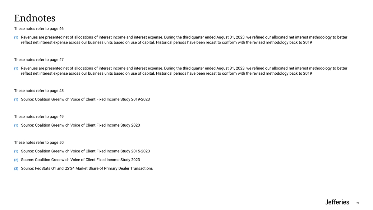 Endnotes These notes refer to page 46 (1) Revenues are presented net of allocations of interest income and interest expense. During the third quarter ended August 31, 2023, we refined our allocated net interest methodology to better reflect net interest expense across our business units based on use of capital. Historical periods have been recast to conform with the revised methodology back to 2019 These notes refer to page 47 (1) Revenues are presented net of allocations of interest income and interest expense. During the third quarter ended August 31, 2023, we refined our allocated net interest methodology to better reflect net interest expense across our business units based on use of capital. Historical periods have been recast to conform with the revised methodology back to 2019 These notes refer to page 48 (1) Source: Coalition Greenwich Voice of Client Fixed Income Study 2019-2023 These notes refer to page 49 (1) Source: Coalition Greenwich Voice of Client Fixed Income Study 2023 These notes refer to page 50 (1) Source: Coalition Greenwich Voice of Client Fixed Income Study 2015-2023 (2) Source: Coalition Greenwich Voice of Client Fixed Income Study 2023 (3) Source: FedStats Q1 and Q2’24 Market Share of Primary Dealer Transactions 72