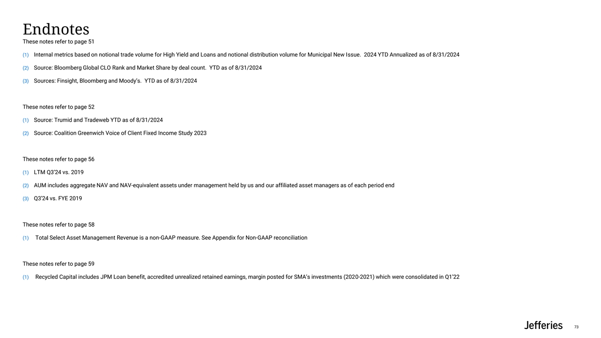 Endnotes These notes refer to page 51 (1) Internal metrics based on notional trade volume for High Yield and Loans and notional distribution volume for Municipal New Issue. 2024 YTD Annualized as of 8/31/2024 (2) Source: Bloomberg Global CLO Rank and Market Share by deal count. YTD as of 8/31/2024 (3) Sources: Finsight, Bloomberg and Moody’s. YTD as of 8/31/2024 These notes refer to page 52 (1) Source: Trumid and Tradeweb YTD as of 8/31/2024 (2) Source: Coalition Greenwich Voice of Client Fixed Income Study 2023 These notes refer to page 56 (1) LTM Q3’24 vs. 2019 (2) AUM includes aggregate NAV and NAV-equivalent assets under management held by us and our affiliated asset managers as of each period end (3) Q3’24 vs. FYE 2019 These notes refer to page 58 (1) Total Select Asset Management Revenue is a non-GAAP measure. See Appendix for Non-GAAP reconciliation These notes refer to page 59 (1) Recycled Capital includes JPM Loan benefit, accredited unrealized retained earnings, margin posted for SMA’s investments (2020-2021) which were consolidated in Q1’22 73