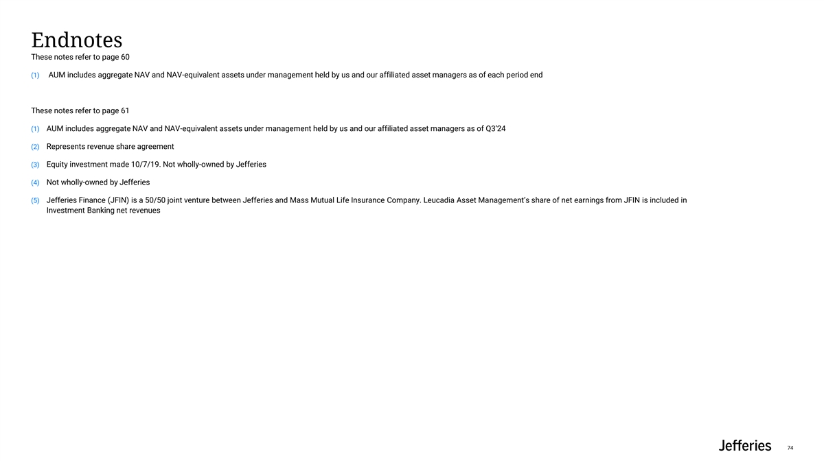 Endnotes These notes refer to page 60 (1) AUM includes aggregate NAV and NAV-equivalent assets under management held by us and our affiliated asset managers as of each period end These notes refer to page 61 (1) AUM includes aggregate NAV and NAV-equivalent assets under management held by us and our affiliated asset managers as of Q3’24 (2) Represents revenue share agreement (3) Equity investment made 10/7/19. Not wholly-owned by Jefferies (4) Not wholly-owned by Jefferies (5) Jefferies Finance (JFIN) is a 50/50 joint venture between Jefferies and Mass Mutual Life Insurance Company. Leucadia Asset Management’s share of net earnings from JFIN is included in Investment Banking net revenues 74
