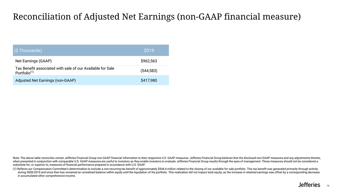 Reconciliation of Adjusted Net Earnings (non-GAAP financial measure) ($ Thousands) 2019 Net Earnings (GAAP) $962,563 Tax Benefit associated with sale of our Available for Sale (544,583) (1) Portfolio Adjusted Net Earnings (non-GAAP) $417,980 Note: The above table reconciles certain Jefferies Financial Group non-GAAP financial information to their respective U.S. GAAP measures. Jefferies Financial Group believes that the disclosed non-GAAP measures and any adjustments thereto, when presented in conjunction with comparable U.S. GAAP measures are useful to investors as they enable investors to evaluate Jefferies Financial Group results through the eyes of management. These measures should not be considered a substitute for, or superior to, measures of financial performance prepared in accordance with U.S. GAAP. (1) Reflects our Compensation Committee’s determination to exclude a non-recurring tax benefit of approximately $544.6 million related to the closing of our available for sale portfolio. This tax benefit was generated primarily through activity during 2008-2010 and since then has remained an unrealized balance within equity until the liquidation of the portfolio. This realization did not impact total equity, as the increase in retained earnings was offset by a corresponding decrease in accumulated other comprehensive income. 75