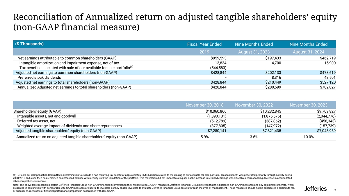 Reconciliation of Annualized return on adjusted tangible shareholders’ equity (non-GAAP financial measure) ($ Thousands) Fiscal Year Ended Nine Months Ended Nine Months Ended 2019 August 31, 2023 August 31, 2024 Net earnings attributable to common shareholders (GAAP) $959,593 $197,433 $462,719 Intangible amortization and impairment expense, net of tax 13,834 4,700 15,900 (1) Tax benefit associated with sale of our available for sale portfolio (544,583) - - Adjusted net earnings to common shareholders (non-GAAP) $428,844 $202,133 $478,619 Preferred stock dividends - 8,316 48,501 Adjusted net earnings to total shareholders (non-GAAP) $428,844 $210,449 $527,120 Annualized Adjusted net earnings to total shareholders (non-GAAP) $428,844 $280,599 $702,827 November 30, 2018 November 30, 2022 November 30, 2023 Shareholders' equity (GAAP) $10,060,866 $10,232,845 $9,709,827 Intangible assets, net and goodwill (1,890,131) (1,875,576) (2,044,776) Deferred tax asset, net (512,789) (387,862) (458,343) Weighted average impact of dividends and share repurchases (377,805) (147,972) (157,739) Adjusted tangible shareholders' equity (non-GAAP) $7,280,141 $7,821,435 $7,048,969 Annualized return on adjusted tangible shareholders' equity (non-GAAP) 5.9% 3.6% 10.0% (1) Reflects our Compensation Committee’s determination to exclude a non-recurring tax benefit of approximately $544.6 million related to the closing of our available for sale portfolio. This tax benefit was generated primarily through activity during 2008-2010 and since then has remained an unrealized balance within equity until the liquidation of the portfolio. This realization did not impact total equity, as the increase in retained earnings was offset by a corresponding decrease in accumulated other comprehensive income. Note: The above table reconciles certain Jefferies Financial Group non-GAAP financial information to their respective U.S. GAAP measures. Jefferies Financial Group believes that the disclosed non-GAAP measures and any adjustments thereto, when presented in conjunction with comparable U.S. GAAP measures are useful to investors as they enable investors to evaluate Jefferies Financial Group results through the eyes of management. These measures should not be considered a substitute for, 76 or superior to, measures of financial performance prepared in accordance with U.S. GAAP.