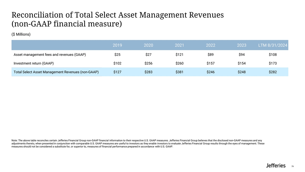 Reconciliation of Total Select Asset Management Revenues (non-GAAP financial measure) ($ Millions) 2019 2020 2021 2022 2023 LTM 8/31/2024 Asset management fees and revenues (GAAP) $25 $27 $121 $89 $94 $108 Investment return (GAAP) $102 $256 $260 $157 $154 $173 Total Select Asset Management Revenues (non-GAAP) $127 $283 $381 $246 $248 $282 Note: The above table reconciles certain Jefferies Financial Group non-GAAP financial information to their respective U.S. GAAP measures. Jefferies Financial Group believes that the disclosed non-GAAP measures and any adjustments thereto, when presented in conjunction with comparable U.S. GAAP measures are useful to investors as they enable investors to evaluate Jefferies Financial Group results through the eyes of management. These measures should not be considered a substitute for, or superior to, measures of financial performance prepared in accordance with U.S. GAAP. 79