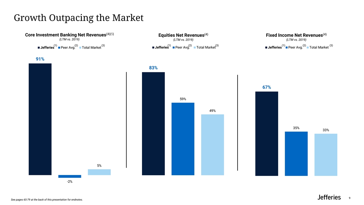 By The Numbers: Jefferies Growth Since 2019 NET REVENUES NET EARNINGS DIVIDEND PER SHARE +35% +61% +180% $6.3B $563M $1.40 (4) 2019 : 2019: $3.9B 2019: $0.50 LTM Q3’24 LTM Q3’24 $418M Annualized Q3’24 INVESTMENT BANKING CAPITAL MARKETS COUNTRIES OFFICES (1) (1) Net Revenues Net Revenues +85% +76% +6 +14 $3.1B $2.6B 21 47 2019: $1.7B 2019: $1.5B 2019: 15 2019: 33 LTM Q3’24 LTM Q3’24 Q3’24 Q3’24 (3) EMPLOYEES GLOBAL M&A GLOBAL ECM GLOBAL STOCK COVERAGE (2) (2) Rank Rank +5 +2 +5 +23% #6 #6 #1 5,926 2019: #11 2019: #8 2019: #6 2019: 4,800 (5) YTD Q3’24 YTD Q3’24 LTM Q3’24 Q3’24 8 See pages 65-79 at the back of this presentation for endnotes.