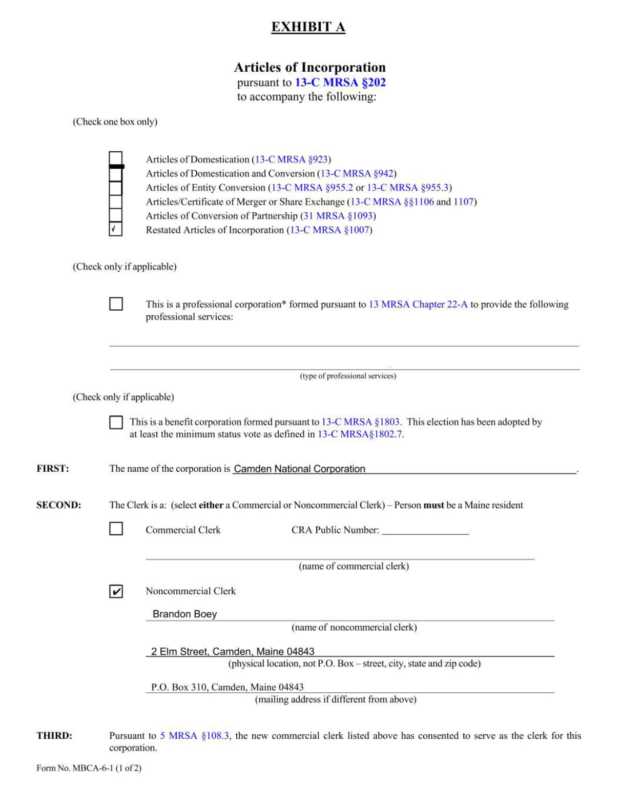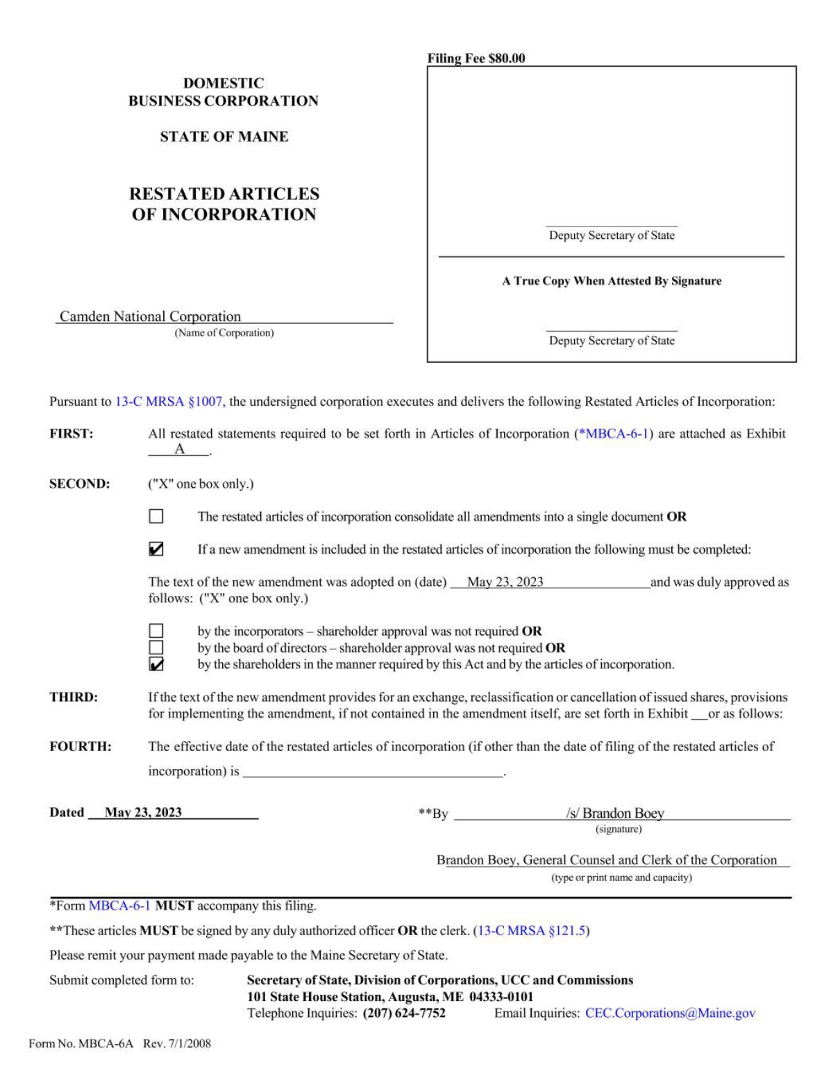 Amended and Restated Articles of Incorporation of Camden National Corporation (filed as Exhibit 3.1 to Camden National Corporation’s Current Report on Form 8-K (File No. 001-13227) filed on May 25, 2023 and incorporated herein by reference). | |||