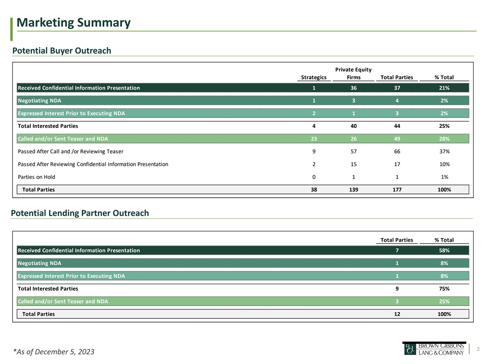 Marketing Summary Potential Buyer Outreach Private Equity Strategics Firms Total Parties % Total Received Confidential Information Presentation 1 36 37 21% Negotiating NDA 1 3 4 2% Expressed Interest Prior to Executing NDA 2 1 3 2% Total Interested Parties 4 40 44 25% Called and/or Sent Teaser and NDA 23 26 49 28% Passed After Call and /or Reviewing Teaser 9 57 66 37% Passed After Reviewing Confidential Information Presentation 2 15 17 10% Parties on Hold 0 1 1 1% Total Parties 38 139 177 100% Potential Lending Partner Outreach Total Parties % Total Received Confidential Information Presentation 7 58% Negotiating NDA 1 8% Expressed Interest Prior to Executing NDA 1 8% Total Interested Parties 9 75% Definitive Called and/or Sent Teaser and NDA 3 25% Bids: Total Parties 12 100% TBD 2 *As of December 5, 2023