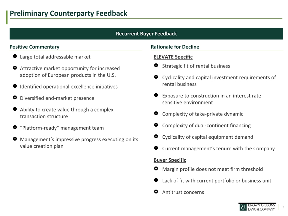 Exhibit (C)(3) STRICTLY CONFIDENTIAL DECEMBER 2023 The blacked out information indicates information has been omitted on the basis of a confidential treatment request pursuant to Rule 24b-2 of the Securities Exchange Act of 1934, as amended. This information has been filed separately with the Securities and Exchange Commission. Discussion Materials of Brown Gibbons Lang & Company for the Board of Directors of Manitex, dated December 6, 2023. Project ELEVATE Board of Directors Meeting Discussion Materials December 6, 2023 ••• CH CH CH CHI I I ICA CA CA CAG G G GO O O O • • • • C C C CLE LE LE LEVE VE VE VELA LA LA LAN N N ND D D D • • • • PHI PHI PHI PHIL L L LA A A AD D D DE E E EL L L LPHI PHI PHI PHIA A A A • • • • S S S SA A A AN N N N AN AN AN ANT T T TO O O ON N N NIO IO IO IO B B B BG G G GLC LC LC LCO. O. O. O.COM COM COM COM