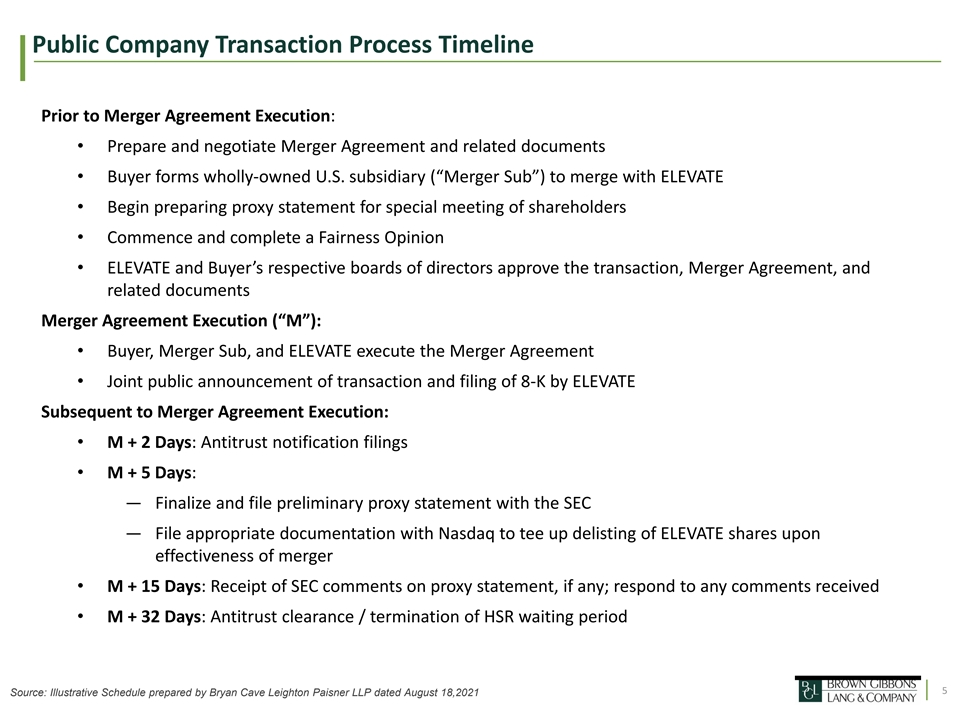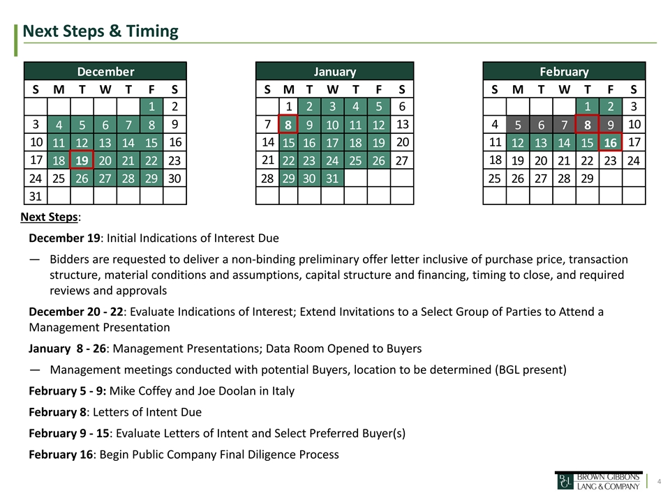 Next Steps & Timing December January February S M T W T F S S M T W T F S S M T W T F S 1 2 1 2 3 4 5 6 1 2 3 3 9 7 13 4 10 4 5 6 7 8 8 9 10 11 12 5 6 7 8 9 10 16 14 20 11 17 11 12 13 14 15 15 16 17 18 19 12 13 14 15 16 17 21 18 18 19 20 21 22 23 22 23 24 25 26 27 19 20 21 22 23 24 24 25 26 27 28 29 30 28 29 30 31 25 26 27 28 29 31 Next Steps: December 19: Initial Indications of Interest Due — Bidders are requested to deliver a non-binding preliminary offer letter inclusive of purchase price, transaction structure, material conditions and assumptions, capital structure and financing, timing to close, and required reviews and approvals December 20 - 22: Evaluate Indications of Interest; Extend Invitations to a Select Group of Parties to Attend a Management Presentation January 8 - 26: Management Presentations; Data Room Opened to Buyers — Management meetings conducted with potential Buyers, location to be determined (BGL present) February 5 - 9: Mike Coffey and Joe Doolan in Italy February 8: Letters of Intent Due February 9 - 15: Evaluate Letters of Intent and Select Preferred Buyer(s) February 16: Begin Public Company Final Diligence Process 4