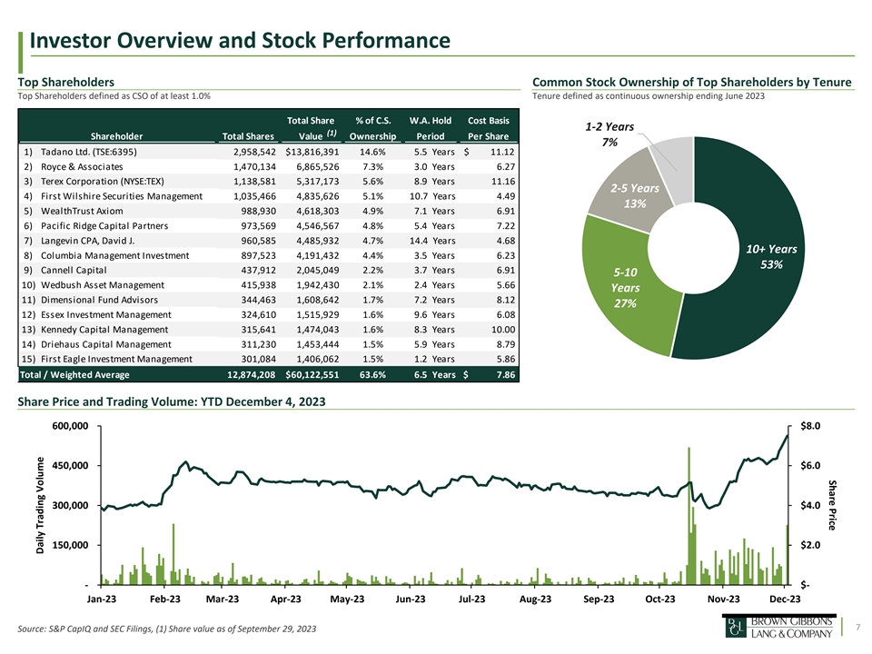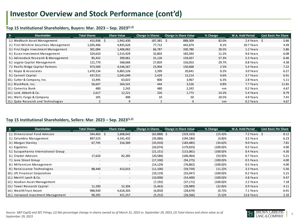 Investor Overview and Stock Performance (cont’d) (1,2) Top 15 Institutional Shareholders, Buyers: Mar. 2023 – Sep. 2023 # Shareholder Total Shares Share Value Change in Shares Change in Share Value % Change W.A. Hold Period Cost Basis Per Share • (1) 1.) Wedbush Asset Management 415,938 $ 1,942,430 187,381 $ 888,309 82. 0% 2.4 Years $ 5.66 2.) First Wilshire Securities Management 1,035,466 4,835,626 77,712 442,674 8.1% 10.7 Years 4.49 3.) First Eagle Investment Management 301,084 1,406,062 66,787 330,780 28.5% 1.2 Years 5. 86 4.) Essex Investment Management 324,610 1,515,929 32,803 183,593 11. 2% 9.6 Years 6.08 5.) Adirondack Research & Management 85,452 399,061 31,126 159,037 57. 3% 5.3 Years 6. 46 6.) Legato Capital Management 121,770 568,666 27,859 156,053 29. 7% 0.8 Years 4. 38 7.) Pacific Ridge Capital Partners 973,569 4,546,567 23,904 150,668 2.5% 5.4 Years 7.22 8.) Royce & Associates 1,470,134 6,865,526 2,399 20,641 0. 2% 3.0 Years 6.27 9.) Cannell Capital 437,912 2,045,049 2,429 13,214 0.6% 3.7 Years 6. 91 10.) Cutter & Company, Inc. 13,495 63,022 800 3,967 6.3% 2.8 Years 5.11 11.) BlackRock, Inc. 56,647 264,541 444 3,526 0.8% 7.7 Years 11. 65 12.) Comerica Bank 480 2,242 480 2,242 nm 0.2 Years 4.67 13.) Lord, Abbett & Co. 2,617 12,221 326 1,773 14. 2% 5.4 Years 8. 79 14.) Wells Fargo & Company 105 490 10 50 10. 5% 4.9 Years 7.41 15.) Qube Research and Technologies 2 9 2 9 nm 0.2 Years 4. 67 (1,2) Top 15 Institutional Shareholders, Sellers: Mar. 2023 – Sep. 2023 # Shareholder Total Shares Share Value Change in Shares Change in Share Value % Change W.A. Hold Period Cost Basis Per Share 1.) Dimensional Fund Advisors 344,463 $ 1,608,642 (62,888) $ (319,163) ( 15.4)% 7.2 Years $ 8. 12 2.) Columbia Management 897,523 4,191,432 (35,086) (194,184) ( 3.8)% 3.5 Years 6. 23 3.) Morgan Stanley 67,745 316,369 (35,910) (183,485) (34.6)% 9.0 Years 7. 81 4.) Ergoteles - - (33,074) (179,923) ( 100.0)% 0.5 Years 4.00 5.) Susquehanna International Group - - (21,151) (115,061) (100.0)% 0.4 Years 4.30 6.) Citadel Advisors 17,620 82,285 (20,586) (106,464) (53.9)% 0.7 Years 5.21 7.) Jane Street Group - - (17,330) (94,275) (100.0)% 0.5 Years 4.00 8.) Millennium Management - - (14,129) (76,862) ( 100.0)% 0.5 Years 4.00 9.) Renaissance Technologies 88,440 413,015 (11,100) (59,759) (11.2)% 3.3 Years 5. 56 10.) LPL Financial Corporation - - (10,119) (55,047) ( 100.0)% 0.2 Years 5.21 11.) Merrill Lynch & Co. - - (10,000) (54,400) ( 100.0)% 4.8 Years 9. 47 12.) Acadian Asset Management - - (7,192) (37,171) (100.0)% 2.2 Years 7. 18 13.) Tower Research Capital 11,200 52,304 (5,463) (28,989) (32.8)% 0.9 Years 4.11 14.) WealthTrust Axiom 988,930 4,618,303 (6,850) (28,679) (0.7)% 7.1 Years 6.91 15.) Ironwood Investment Management 90,205 421,257 (5,252) (26,566) ( 5.5)% 13.6 Years 2. 10 Source: S&P CapIQ and SEC Filings; (1) Net percentage change in shares owned as of March 31, 2023 vs. September 29, 2023, (2) Total shares and share value as of 8 September 29, 2023 Source: Capital IQ as of May 12, 2021 (1) Based on a weighted average price per share at the time of purchase