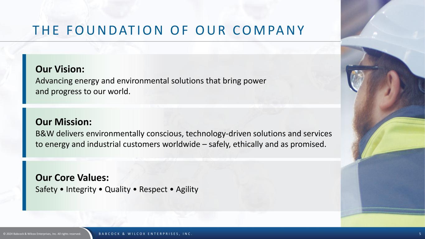 © 2024 Babcock & Wilcox Enterprises, Inc. All rights reserved. B A B C O C K & W I L C O X E N T E R P R I S E S , I N C . 4 W E ’ R E H E L P I N G C U S TO M E R S C R E AT E C L E A N A N D R E L I A B L E E N E R G Y SUPPORTING A CIRCULAR ECONOMY Ecologically sound ways of using and recycling resources like biomass and municipal waste to create clean, renewable baseload power while reducing greenhouse gas emissions. REDUCING THE IMPACT OF GREENHOUSE GAS EMISSIONS Hydrogen production, carbon capture, ash handling, energy recovery and storage, and advanced emissions control solutions to help preserve the world’s natural resources. CREATING RELIABLE AND EFFICIENT STEAM GENERATION Providing boilers and related equipment, aftermarket parts, service and upgrades to help utilities and industries generate reliable thermal energy from a wide range of fuels and bridge the gap during the global transition to new energy sources. CL EA N E N ER G Y SO LU TI O N S TR AD IT IO N AL DELIVERING VALUE THROUGH TECHNOLOGY-DRIVEN PRODUCTS AND SERVICES, WITH CONTINUAL PRODUCT IMPROVEMENT AND ROBUST R&D EFFORTS TO SUPPORT CURRENT AND FUTURE ENERGY NEEDS