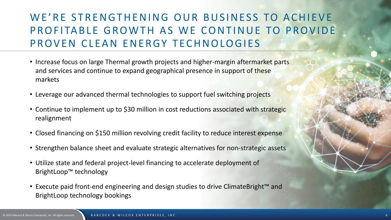 © 2024 Babcock & Wilcox Enterprises, Inc. All rights reserved. B A B C O C K & W I L C O X E N T E R P R I S E S , I N C . 2 S A F E H A R B O R S TAT E M E N T B&W Enterprises cautions that this presentation contains forward-looking statements within the meaning of federal securities laws. All statements other than statements of historical or current fact included in this presentation are forward-looking statements, including, without limitation, statements relating to the company's business outlook and expected financial performance, including adjusted EBITDA and sales targets, expectations regarding future growth, expansion and profitability, outlook and expectations regarding B&W’s BrightLoop™ technologies, as well as statements about B&W’s future pipeline of new projects and business within its Renewable, Environmental and Thermal operating segments and their impact on future shareholder value. These forward-looking statements are based on management’s current expectations and involve a number of risks and uncertainties, including, among other things: our financial condition and ability to continue as a going concern; risks associated with contractual pricing in our industry; the impact of global macroeconomic conditions, including inflation and volatility in the capital markets; our relationships with customers, subcontractors and other third parties; our ability to comply with our contractual obligations; disruptions at our or manufacturing facilities or a third-party manufacturing facility that we have engaged; the actions or failures of our co-venturers; our ability to implement our growth strategy, including through strategic acquisitions, which we may not successfully consummate or integrate; our evaluation of strategic alternatives for certain businesses and non-core assets which may not result in successful transactions; the risks of unexpected adjustments and cancellations in our backlog; professional liability, product liability, warranty and other claims; our ability to compete successfully against current and future competitors; our ability to develop and successfully market new products; the impacts of industry conditions and public health crises; the cyclical nature of the industries in which we operate; changes in the legislative and regulatory environment in which we operate; supply chain issues, including shortages of adequate components; failure to properly estimate customer demand; our ability to comply with the covenants in our debt agreements; our ability to refinance our 8.125% Notes due 2026 and 6.50% Notes due 2026 prior to their maturity; our ability to maintain adequate bonding and letter of credit capacity; impairment of goodwill or other indefinite-lived intangible assets; credit risk; disruptions in, or failures of, our information systems; our ability to comply with privacy and information security laws; our ability to protect our intellectual property and use the intellectual property that we license from third parties; risks related to our international operations, including fluctuations in the value of foreign currencies, global tariffs, sanctions and export controls; could harm our profitability; volatility in the price of our common stock; B. Riley’s significant influence over us; changes in tax rates or tax law; our ability to use net operating loss and certain tax credits; our ability to maintain effective internal control over financial reporting; our ability to attract and retain skilled personnel and senior management; labor problems, including negotiations with labor unions and possible work stoppages; risks associated with our retirement benefit plans; natural disasters or other events beyond our control, such as war, armed conflicts or terrorist attacks and the other factors specified and set forth under "Risk Factors" in our periodic reports filed with the Securities and Exchange Commission, including, without limitation, the risks described in the Company's Annual Report on Form 10-K for the year ended December 31, 2023 under the caption "Risk Factors" and "Management's Discussion and Analysis of Financial Condition and Results of Operations" (as applicable). These factors should be considered carefully, and B&W Enterprises cautions you not to place undue reliance on these forward-looking statements, which speak only as of the date of this presentation, and undertakes no obligation to update or revise any forward-looking statement, except to the extent required by applicable law. Non-GAAP Financial Measures Adjusted EBITDA on a consolidated basis is a non-GAAP metric defined as the sum of the adjusted EBITDA for each of the segments, further adjusted for corporate allocations and research and development costs. At a segment level, adjusted EBITDA presented is consistent with the way our chief operating decision maker reviews the results of operations and makes strategic decisions about the business and is calculated as earnings before interest expense, tax, depreciation and amortization adjusted for items such as gains or losses arising from the sale of non-income producing assets, net pension benefits, restructuring costs, impairments, gains and losses on debt extinguishment, costs related to financial consulting, research and development costs and other costs that may not be directly controllable by segment management and are not allocated to the segment. We present consolidated Adjusted EBITDA because we believe it is useful to investors to help facilitate comparisons of our ongoing, operating performance before corporate overhead and other expenses not attributable to the operating performance of our revenue generating segments. In addition, the Company presents the non-GAAP financial measure of Adjusted EBITDA excluding BrightLoop™ and ClimateBright™. Management believes this measure is useful to investors because of the increasing importance of BrightLoop™ and ClimateBright™ to the future growth of the Company. Ma