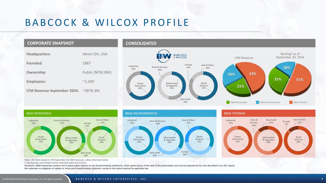© 2024 Babcock & Wilcox Enterprises, Inc. All rights reserved. B A B C O C K & W I L C O X E N T E R P R I S E S , I N C . 7 W E ' R E L E V E R A G I N G A VA S T I N S TA L L E D B A S E A N D P R O V E N T E C H N O L O G I E S More than 300 operating utility and industrial boiler units in the U.S. and nearly 200 operating utility and industrial boiler units across 40 countries around the world More than 5,000 industrial water- tube package boilers and other waste heat recovery products installed in a variety of facilities Average approximately 500,000 Boilermakers’ construction manhours per year over last five years More than 500 waste-to-energy and biomass-to-energy units at 300+ facilities globally (consuming over 61 million tonnes of waste per year) and a leader in plant availability Serving utility, waste management, municipality and investment firm customers Large worldwide installed base of wet and dry scrubbers for SOX reduction, particulate control equipment, NOX reduction technologies, and mercury control systems to meet environmental regulations Flue gas pre-treatment technologies for use with CO2 capture A VAST GLOBAL INSTALLATION OF B&W’S CORE TECHNOLOGIES AT UTILITY AND INDUSTRIAL PLANTS CREATES LARGE GROWTH OPPORTUNITIES FOR PARTS, SERVICES AND RETROFITS