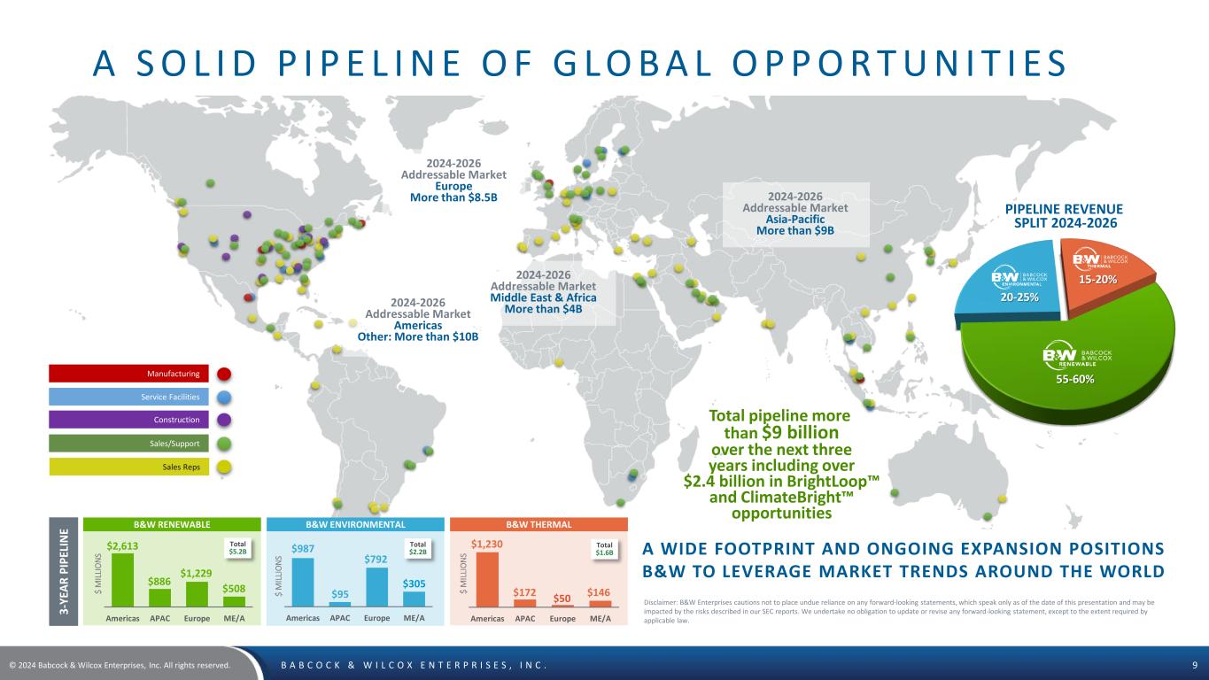 © 2024 Babcock & Wilcox Enterprises, Inc. All rights reserved. B A B C O C K & W I L C O X E N T E R P R I S E S , I N C . 9 55-60% 15-20% 20-25% PIPELINE REVENUE SPLIT 2024-2026 A S O L I D P I P E L I N E O F G L O B A L O P P O R T U N I T I E S Manufacturing Service Facilities Construction Sales/Support Sales Reps Americas APAC Europe ME/A $2,613 $886 $1,229 $508$ M IL LI O N S B&W RENEWABLE Americas APAC Europe ME/A $987 $95 $792 $305 $ M IL LI O N S B&W ENVIRONMENTAL Americas APAC Europe ME/A $1,230 $172 $50 $146$ M IL LI O N S B&W THERMAL 3- YE AR P IP EL IN E Total pipeline more than $9 billion over the next three years including over $2.4 billion in BrightLoop™ and ClimateBright™ opportunities Disclaimer: B&W Enterprises cautions not to place undue reliance on any forward-looking statements, which speak only as of the date of this presentation and may be impacted by the risks described in our SEC reports. We undertake no obligation to update or revise any forward-looking statement, except to the extent required by applicable law. 2024-2026 Addressable Market Europe More than $8.5B 2024-2026 Addressable Market Americas Other: More than $10B 2024-2026 Addressable Market Asia-Pacific More than $9B A WIDE FOOTPRINT AND ONGOING EXPANSION POSITIONS B&W TO LEVERAGE MARKET TRENDS AROUND THE WORLD 2024-2026 Addressable Market Middle East & Africa More than $4B Total $5.2B Total $2.2B Total $1.6B