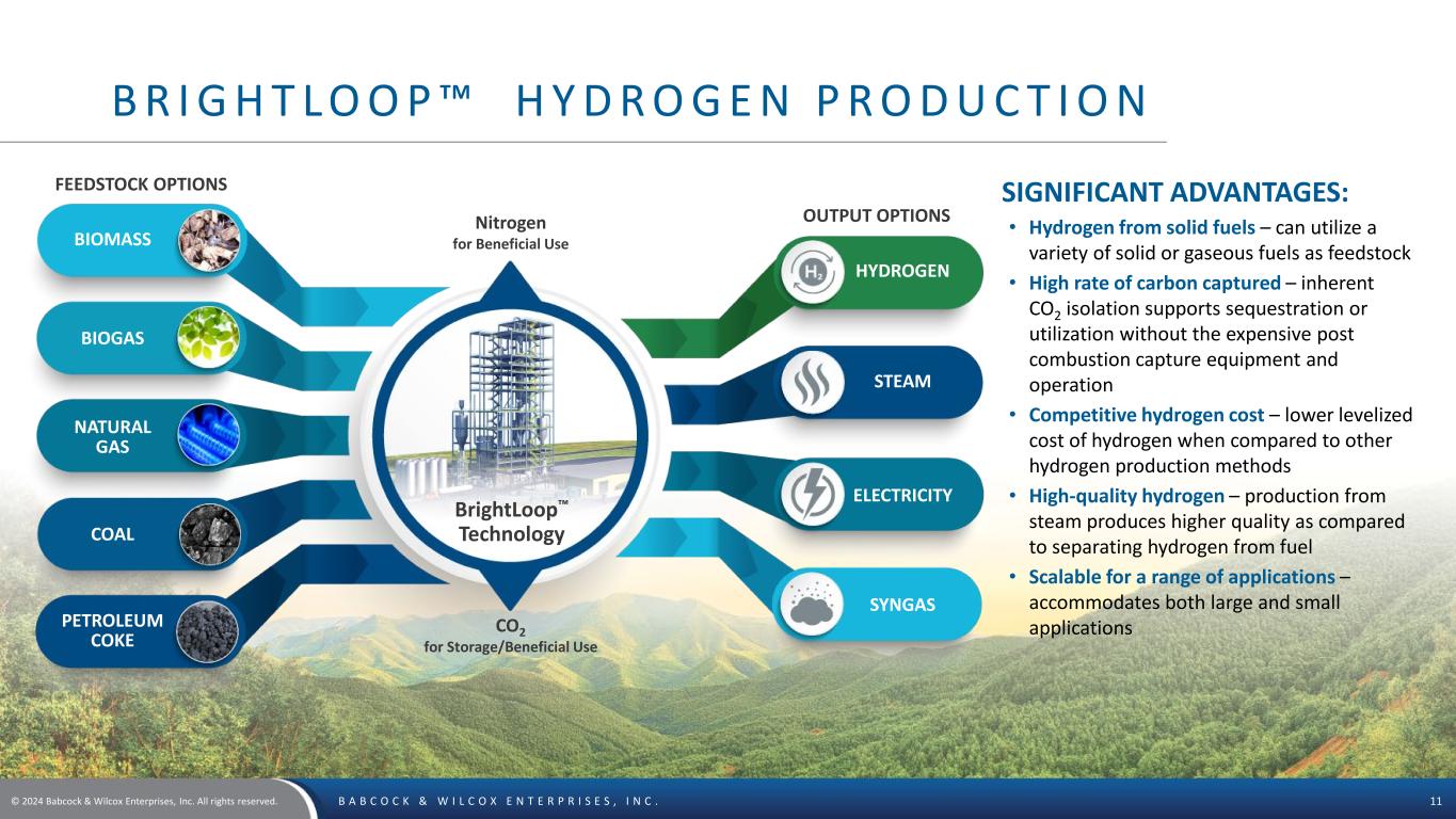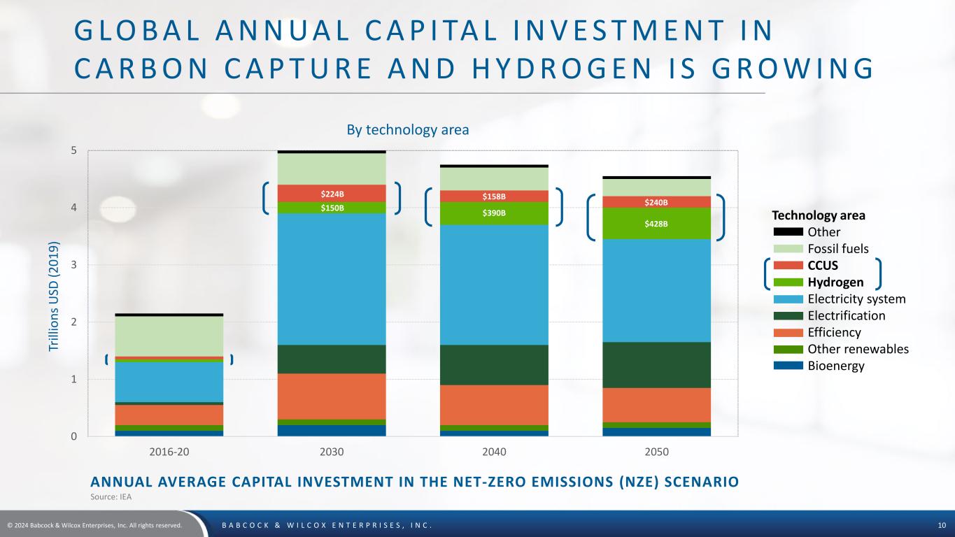 © 2024 Babcock & Wilcox Enterprises, Inc. All rights reserved. B A B C O C K & W I L C O X E N T E R P R I S E S , I N C . 10 G L O B A L A N N U A L C A P I TA L I N V E S T M E N T I N C A R B O N C A P T U R E A N D H Y D R O G E N I S G R O W I N G Tr ill io ns U SD (2 01 9) 0 1 2 3 4 5 2016-20 2030 2040 2050 By technology area Technology area Other Fossil fuels CCUS Hydrogen Electricity system Electrification Efficiency Other renewables Bioenergy ANNUAL AVERAGE CAPITAL INVESTMENT IN THE NET-ZERO EMISSIONS (NZE) SCENARIO Source: IEA $224B $150B $158B $390B $240B $428B
