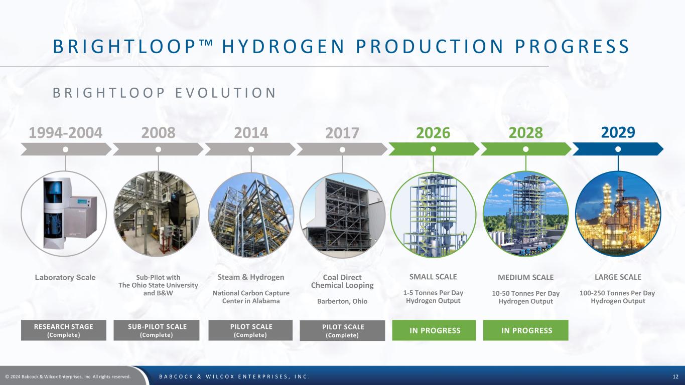 © 2024 Babcock & Wilcox Enterprises, Inc. All rights reserved. B A B C O C K & W I L C O X E N T E R P R I S E S , I N C . 11 B R I G H T L O O P ™ H Y D R O G E N P R O D U C T I O N SIGNIFICANT ADVANTAGES: • Hydrogen from solid fuels – can utilize a variety of solid or gaseous fuels as feedstock • High rate of carbon captured – inherent CO2 isolation supports sequestration or utilization without the expensive post combustion capture equipment and operation • Competitive hydrogen cost – lower levelized cost of hydrogen when compared to other hydrogen production methods • High-quality hydrogen – production from steam produces higher quality as compared to separating hydrogen from fuel • Scalable for a range of applications – accommodates both large and small applications BIOMASS FEEDSTOCK OPTIONS OUTPUT OPTIONSNitrogen for Beneficial Use BIOGAS COAL NATURAL GAS STEAM SYNGAS HYDROGEN ELECTRICITY PETROLEUM COKE CO2 for Storage/Beneficial Use BrightLoop™ Technology
