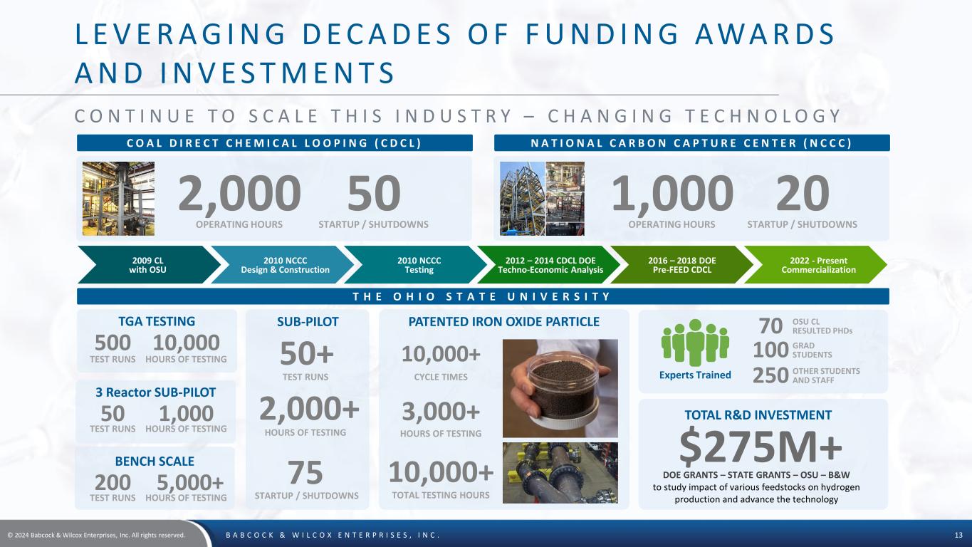 © 2024 Babcock & Wilcox Enterprises, Inc. All rights reserved. B A B C O C K & W I L C O X E N T E R P R I S E S , I N C . 12 B R I G H T L O O P ™ H Y D R O G E N P R O D U C T I O N P R O G R E S S B R I G H T L O O P E V O L U T I O N Sub-Pilot with The Ohio State University and B&W MEDIUM SCALE 10-50 Tonnes Per Day Hydrogen Output LARGE SCALE 100-250 Tonnes Per Day Hydrogen Output SUB-PILOT SCALE (Complete) 2008 2028 2029 IN PROGRESS Laboratory Scale RESEARCH STAGE (Complete) 1994-2004 PILOT SCALE (Complete) Steam & Hydrogen National Carbon Capture Center in Alabama 2014 SMALL SCALE 1-5 Tonnes Per Day Hydrogen Output IN PROGRESS 2026 PILOT SCALE (Complete) Coal Direct Chemical Looping Barberton, Ohio 2017