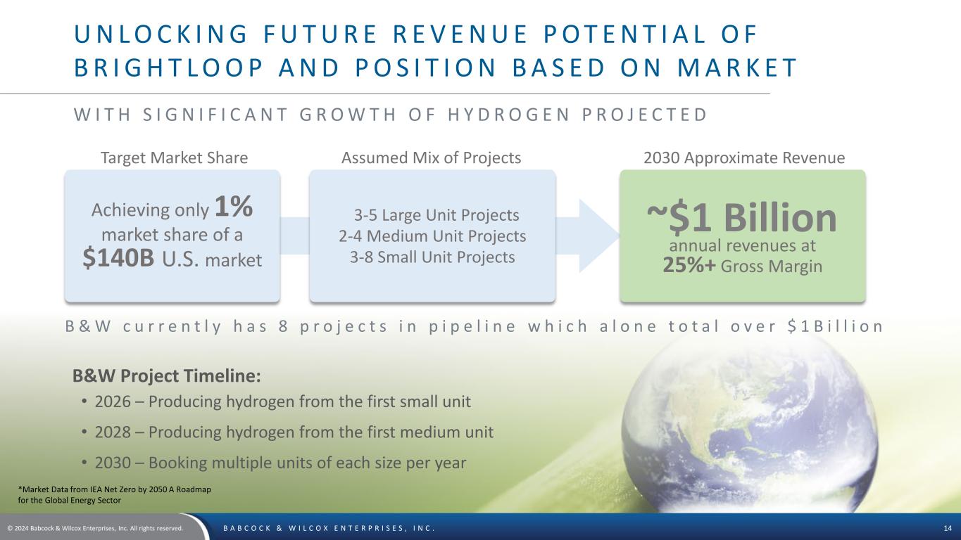 © 2024 Babcock & Wilcox Enterprises, Inc. All rights reserved. B A B C O C K & W I L C O X E N T E R P R I S E S , I N C . 13 L E V E R A G I N G D E C A D E S O F F U N D I N G AWA R D S A N D I N V E S T M E N T S C O N T I N U E T O S C A L E T H I S I N D U S T R Y – C H A N G I N G T E C H N O L O G Y C O A L D I R E C T C H E M I C A L L O O P I N G ( C D C L ) N A T I O N A L C A R B O N C A P T U R E C E N T E R ( N C C C ) T H E O H I O S T A T E U N I V E R S I T Y OPERATING HOURS 2,000 STARTUP / SHUTDOWNS 50 OPERATING HOURS 1,000 STARTUP / SHUTDOWNS 20 $275M+ PATENTED IRON OXIDE PARTICLETGA TESTING TEST RUNS HOURS OF TESTING 500 10,000 BENCH SCALE TEST RUNS HOURS OF TESTING 200 5,000+ 3 Reactor SUB-PILOT TEST RUNS HOURS OF TESTING 50 1,000 SUB-PILOT TEST RUNS 50+ HOURS OF TESTING 2,000+ STARTUP / SHUTDOWNS 75 TOTAL R&D INVESTMENT CYCLE TIMES 10,000+ HOURS OF TESTING 3,000+ TOTAL TESTING HOURS 10,000+ DOE GRANTS – STATE GRANTS – OSU – B&W to study impact of various feedstocks on hydrogen production and advance the technology OSU CL RESULTED PHDs GRAD STUDENTS 70 100 OTHER STUDENTS AND STAFF250Experts Trained 2016 – 2018 DOE Pre-FEED CDCL 2009 CL with OSU 2010 NCCC Testing 2012 – 2014 CDCL DOE Techno-Economic Analysis 2010 NCCC Design & Construction 2022 - Present Commercialization