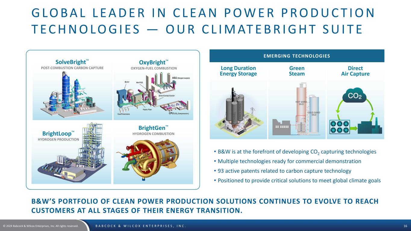 © 2024 Babcock & Wilcox Enterprises, Inc. All rights reserved. B A B C O C K & W I L C O X E N T E R P R I S E S , I N C . 15 H Y D R O G E N P R O D U C T I O N A N D C O S T S Note: BLH Projections based on $1 / MMBTU feedstock; Source: DNV 2020 2030 2050 Coal gasification 2020 2030 2050 Coal gasification with CCS 2020 2030 2050 Methane reforming 2020 2030 2050 Methane reforming with CCS 2020 2030 2050 Dedicated renewable electrolysis 2020 2030 2050 Grid-based electrolysis 2020 2030 2050 Dedicated nuclear electrolysis weighted world average 0 1 2 3 4 5 6 7 Levelized cost of hydrogen after support by production route U SD /k gH 2 Medium BrightLoop Large BrightLoop BrightLoop produces low-cost hydrogen compared to the competition