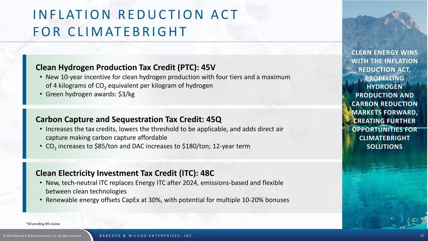 © 2024 Babcock & Wilcox Enterprises, Inc. All rights reserved. B A B C O C K & W I L C O X E N T E R P R I S E S , I N C . 17 I N F L AT I O N R E D U C T I O N A C T F O R C L I M AT E B R I G H T Clean Hydrogen Production Tax Credit (PTC): 45V • New 10-year incentive for clean hydrogen production with four tiers and a maximum of 4 kilograms of CO2 equivalent per kilogram of hydrogen • Green hydrogen awards: $3/kg Carbon Capture and Sequestration Tax Credit: 45Q • Increases the tax credits, lowers the threshold to be applicable, and adds direct air capture making carbon capture affordable • CO2 increases to $85/ton and DAC increases to $180/ton; 12-year term Clean Electricity Investment Tax Credit (ITC): 48C • New, tech-neutral ITC replaces Energy ITC after 2024, emissions-based and flexible between clean technologies • Renewable energy offsets CapEx at 30%, with potential for multiple 10-20% bonuses CLEAN ENERGY WINS WITH THE INFLATION REDUCTION ACT, PROPELLING HYDROGEN PRODUCTION AND CARBON REDUCTION MARKETS FORWARD, CREATING FURTHER OPPORTUNITIES FOR CLIMATEBRIGHT SOLUTIONS *All pending IRS review