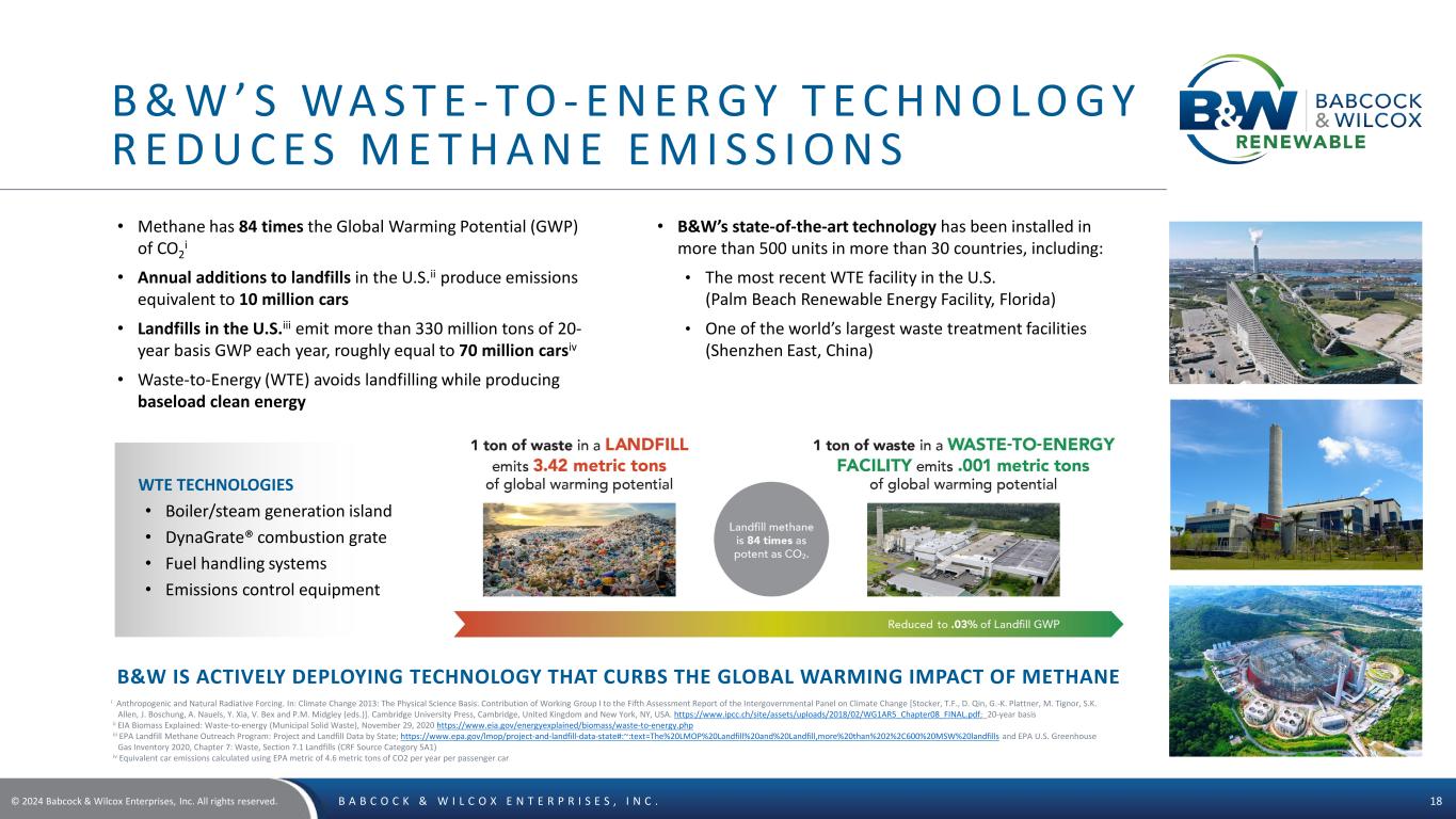 © 2024 Babcock & Wilcox Enterprises, Inc. All rights reserved. B A B C O C K & W I L C O X E N T E R P R I S E S , I N C . 18 B & W ’ S WA S T E - TO - E N E R G Y T E C H N O L O G Y R E D U C E S M E T H A N E E M I S S I O N S • Methane has 84 times the Global Warming Potential (GWP) of CO2 i • Annual additions to landfills in the U.S.ii produce emissions equivalent to 10 million cars • Landfills in the U.S.iii emit more than 330 million tons of 20- year basis GWP each year, roughly equal to 70 million carsiv • Waste-to-Energy (WTE) avoids landfilling while producing baseload clean energy WTE TECHNOLOGIES • Boiler/steam generation island • DynaGrate® combustion grate • Fuel handling systems • Emissions control equipment • B&W’s state-of-the-art technology has been installed in more than 500 units in more than 30 countries, including: • The most recent WTE facility in the U.S. (Palm Beach Renewable Energy Facility, Florida) • One of the world’s largest waste treatment facilities (Shenzhen East, China) i Anthropogenic and Natural Radiative Forcing. In: Climate Change 2013: The Physical Science Basis. Contribution of Working Group I to the Fifth Assessment Report of the Intergovernmental Panel on Climate Change [Stocker, T.F., D. Qin, G.-K. Plattner, M. Tignor, S.K. Allen, J. Boschung, A. Nauels, Y. Xia, V. Bex and P.M. Midgley (eds.)]. Cambridge University Press, Cambridge, United Kingdom and New York, NY, USA. https://www.ipcc.ch/site/assets/uploads/2018/02/WG1AR5_Chapter08_FINAL.pdf; 20-year basis ii EIA Biomass Explained: Waste-to-energy (Municipal Solid Waste), November 29, 2020 https://www.eia.gov/energyexplained/biomass/waste-to-energy.php iii EPA Landfill Methane Outreach Program: Project and Landfill Data by State; https://www.epa.gov/lmop/project-and-landfill-data-state#:~:text=The%20LMOP%20Landfill%20and%20Landfill,more%20than%202%2C600%20MSW%20landfills and EPA U.S. Greenhouse Gas Inventory 2020, Chapter 7: Waste, Section 7.1 Landfills (CRF Source Category 5A1) iv Equivalent car emissions calculated using EPA metric of 4.6 metric tons of CO2 per year per passenger car B&W IS ACTIVELY DEPLOYING TECHNOLOGY THAT CURBS THE GLOBAL WARMING IMPACT OF METHANE