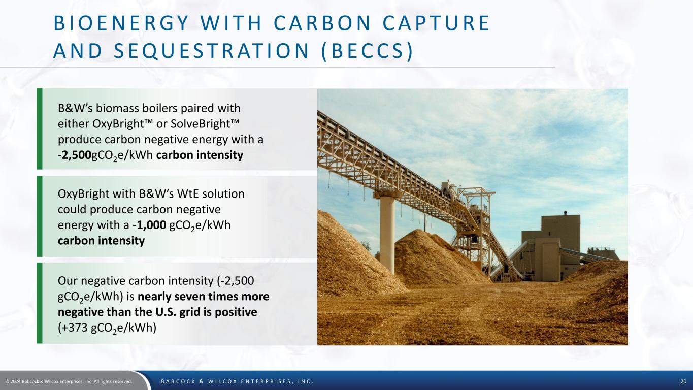 © 2024 Babcock & Wilcox Enterprises, Inc. All rights reserved. B A B C O C K & W I L C O X E N T E R P R I S E S , I N C . 20 B I O E N E R G Y W I T H C A R B O N C A P T U R E A N D S E Q U E S T R AT I O N ( B E C C S ) B&W’s biomass boilers paired with either OxyBright™ or SolveBright™ produce carbon negative energy with a -2,500gCO2e/kWh carbon intensity OxyBright with B&W’s WtE solution could produce carbon negative energy with a -1,000 gCO2e/kWh carbon intensity Our negative carbon intensity (-2,500 gCO2e/kWh) is nearly seven times more negative than the U.S. grid is positive (+373 gCO2e/kWh)