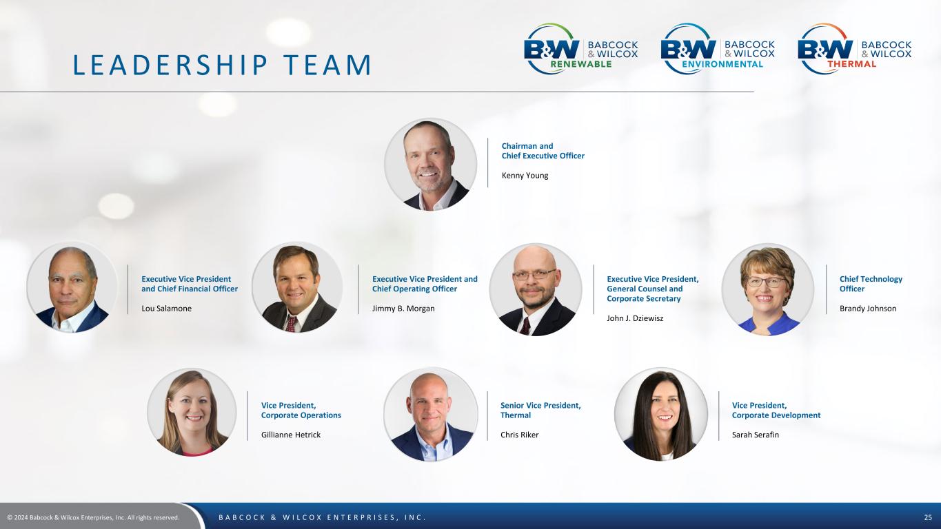 © 2024 Babcock & Wilcox Enterprises, Inc. All rights reserved. B A B C O C K & W I L C O X E N T E R P R I S E S , I N C . 25 L E A D E R S H I P T E A M Chairman and Chief Executive Officer Kenny Young Executive Vice President and Chief Financial Officer Lou Salamone Executive Vice President and Chief Operating Officer Jimmy B. Morgan Executive Vice President, General Counsel and Corporate Secretary John J. Dziewisz Chief Technology Officer Brandy Johnson Senior Vice President, Thermal Chris Riker Vice President, Corporate Operations Gillianne Hetrick Vice President, Corporate Development Sarah Serafin