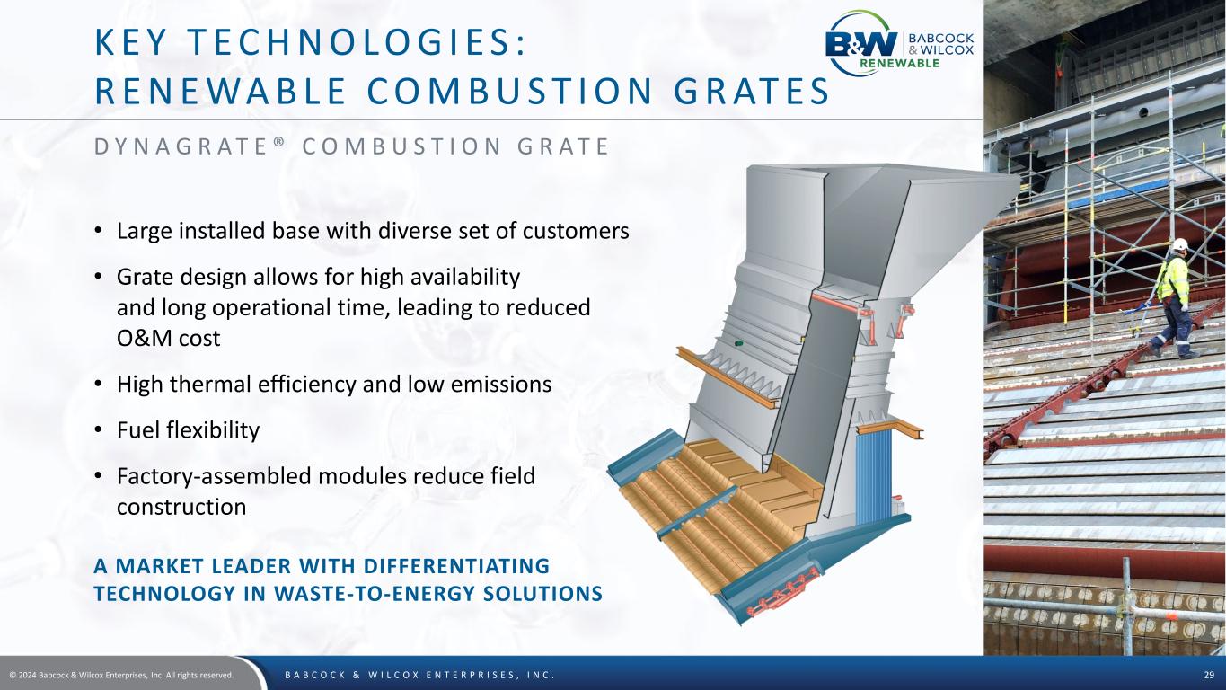 © 2024 Babcock & Wilcox Enterprises, Inc. All rights reserved. B A B C O C K & W I L C O X E N T E R P R I S E S , I N C . 28 K E Y T E C H N O L O G I E S : S T E A M G E N E R AT I O N Utility Boilers High pressure, high efficiency, high capacity, low emissions Fuel: Coal, oil, natural gas, multi-fuel Natural Gas-Fired and Other Industrial Water-Tube and Fire-Tube Boilers Bottom- or top-supported, shop- or field-assembled Fuel: Natural gas, oil, CO, waste heat and gases Heat Recovery Steam Generator Components Pressure parts, casing, ducting, drums, housing and frames Fuel: Waste heat and gases Waste-to-Energy Boilers Reduces dependency on landfills and reduces methane gas emissions Fuel: MSW, RDF Biomass-Fired Boilers Carbon-neutral technology Fuel: Wood, wood waste, straw, sludge Process Recovery Boilers Single-drum, industry-standard unit for improved mill operation Fuel: Black liquor
