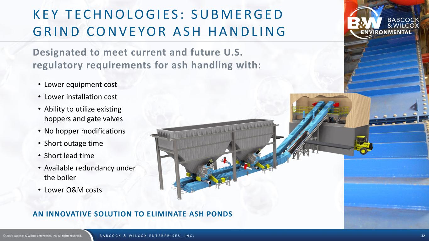 © 2024 Babcock & Wilcox Enterprises, Inc. All rights reserved. B A B C O C K & W I L C O X E N T E R P R I S E S , I N C . 32 K E Y T E C H N O L O G I E S : S U B M E R G E D G R I N D C O N V E YO R A S H H A N D L I N G • Lower equipment cost • Lower installation cost • Ability to utilize existing hoppers and gate valves • No hopper modifications • Short outage time • Short lead time • Available redundancy under the boiler • Lower O&M costs Designated to meet current and future U.S. regulatory requirements for ash handling with: AN INNOVATIVE SOLUTION TO ELIMINATE ASH PONDS