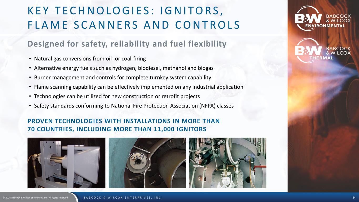 © 2024 Babcock & Wilcox Enterprises, Inc. All rights reserved. B A B C O C K & W I L C O X E N T E R P R I S E S , I N C . 34 K E Y T E C H N O L O G I E S : I G N I TO R S , F L A M E S C A N N E R S A N D C O N T R O L S • Natural gas conversions from oil- or coal-firing • Alternative energy fuels such as hydrogen, biodiesel, methanol and biogas • Burner management and controls for complete turnkey system capability • Flame scanning capability can be effectively implemented on any industrial application • Technologies can be utilized for new construction or retrofit projects • Safety standards conforming to National Fire Protection Association (NFPA) classes Designed for safety, reliability and fuel flexibility PROVEN TECHNOLOGIES WITH INSTALLATIONS IN MORE THAN 70 COUNTRIES, INCLUDING MORE THAN 11,000 IGNITORS