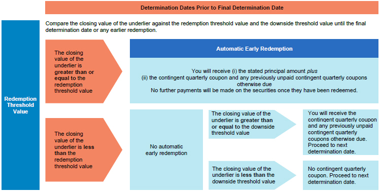 The securities offer the opportunity for investors to receive a contingent quarterly coupon equal to 2.725% of the stated principal amount (a rate of 10.90% per annum), but only with respect to each determination date on which the closing value of the underlier is greater than or equal to 50% of the initial underlier value, which we refer to as the downside threshold value. A contingent quarterly coupon that is not payable with respect to a determination date may be paid later, but only if the closing value of the underlier is greater than or equal to the downside threshold value on a later determination date. The securities may be redeemed prior to maturity for the stated principal amount plus the contingent quarterly coupon and any previously unpaid contingent quarterly coupons otherwise due, and the payment at maturity will vary depending on the final underlier value, as demonstrated in scenarios 2 and 3 below.