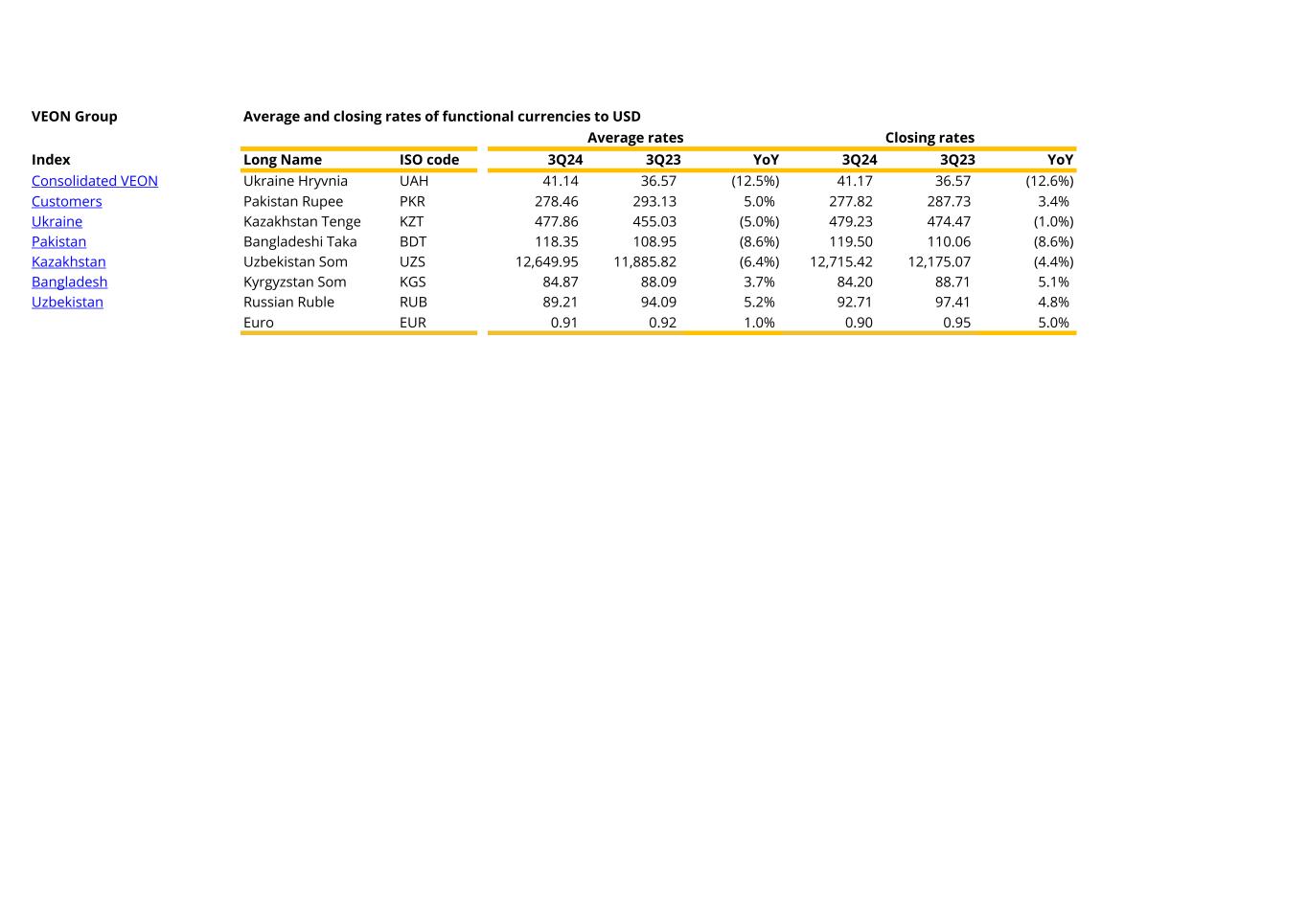 VEON Group Average and closing rates of functional currencies to USD Index Long Name ISO code 3Q24 3Q23 YoY 3Q24 3Q23 YoY Consolidated VEON Ukraine Hryvnia UAH 41.14 36.57 (12.5%) 41.17 36.57 (12.6%) Customers Pakistan Rupee PKR 278.46 293.13 5.0% 277.82 287.73 3.4% Ukraine Kazakhstan Tenge KZT 477.86 455.03 (5.0%) 479.23 474.47 (1.0%) Pakistan Bangladeshi Taka BDT 118.35 108.95 (8.6%) 119.50 110.06 (8.6%) Kazakhstan Uzbekistan Som UZS 12,649.95 11,885.82 (6.4%) 12,715.42 12,175.07 (4.4%) Bangladesh Kyrgyzstan Som KGS 84.87 88.09 3.7% 84.20 88.71 5.1% Uzbekistan Russian Ruble RUB 89.21 94.09 5.2% 92.71 97.41 4.8% Euro EUR 0.91 0.92 1.0% 0.90 0.95 5.0% Average rates Closing rates