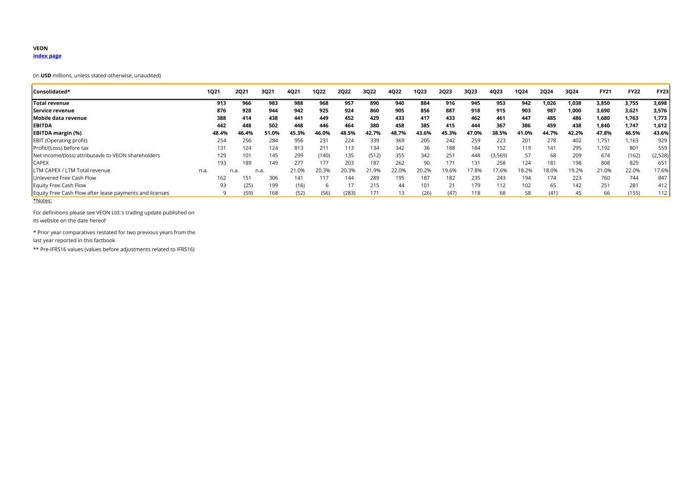 VEON index page (in USD millions, unless stated otherwise, unaudited) Consolidated* 1Q21 2Q21 3Q21 4Q21 1Q22 2Q22 3Q22 4Q22 1Q23 2Q23 3Q23 4Q23 1Q24 2Q24 3Q24 FY21 FY22 FY23 Total revenue 913 966 983 988 968 957 890 940 884 916 945 953 942 1,026 1,038 3,850 3,755 3,698 Service revenue 876 928 944 942 925 924 860 905 856 887 918 915 903 987 1,000 3,690 3,621 3,576 Mobile data revenue 388 414 438 441 449 452 429 433 417 433 462 461 447 485 486 1,680 1,763 1,773 EBITDA 442 448 502 448 446 464 380 458 385 415 444 367 386 459 438 1,840 1,747 1,612 EBITDA margin (%) 48.4% 46.4% 51.0% 45.3% 46.0% 48.5% 42.7% 48.7% 43.6% 45.3% 47.0% 38.5% 41.0% 44.7% 42.2% 47.8% 46.5% 43.6% EBIT (Operating profit) 254 256 284 956 231 224 339 369 205 242 259 223 201 278 402 1,751 1,163 929 Profit/(Loss) before tax 131 124 124 813 211 113 134 342 36 188 184 152 119 141 295 1,192 801 559 Net income/(loss) attributavle to VEON shareholders 129 101 145 299 (140) 135 (512) 355 342 251 448 (3,569) 57 68 209 674 (162) (2,528) CAPEX 193 189 149 277 177 203 187 262 90 171 131 258 124 181 198 808 829 651 LTM CAPEX / LTM Total revenue n.a. n.a. n.a. 21.0% 20.3% 20.3% 21.9% 22.0% 20.2% 19.6% 17.8% 17.6% 18.2% 18.0% 19.2% 21.0% 22.0% 17.6% Unlevered Free Cash Flow 162 151 306 141 117 144 289 195 187 182 235 243 194 174 223 760 744 847 Equity Free Cash Flow 93 (25) 199 (16) 6 17 215 44 101 21 179 112 102 65 142 251 281 412 Equity Free Cash Flow after lease payments and licenses 9 (59) 168 (52) (56) (283) 171 13 (26) (47) 118 68 58 (41) 45 66 (155) 112 *Notes: For definitions please see VEON Ltd.’s trading update published on its website on the date hereof * Prior year comparatives restated for two previous years from the last year reported in this factbook ** Pre-IFRS16 values (values before adjustments related to IFRS16)