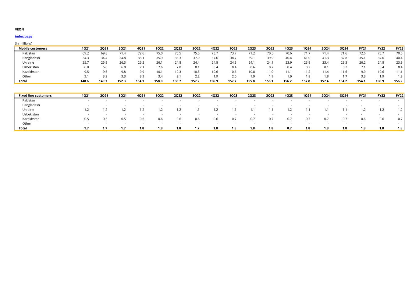 VEON index page (in millions) Mobile customers 1Q21 2Q21 3Q21 4Q21 1Q22 2Q22 3Q22 4Q22 1Q23 2Q23 3Q23 4Q23 1Q24 2Q24 3Q24 FY21 FY22 FY23 Pakistan 69.2 69.8 71.4 72.6 75.0 75.5 75.0 73.7 73.7 71.2 70.5 70.6 71.7 71.4 71.6 72.6 73.7 70.6 Bangladesh 34.3 34.4 34.8 35.1 35.9 36.3 37.0 37.6 38.7 39.1 39.9 40.4 41.0 41.3 37.8 35.1 37.6 40.4 Ukraine 25.7 25.9 26.3 26.2 26.1 24.8 24.4 24.8 24.3 24.1 24.1 23.9 23.9 23.4 23.3 26.2 24.8 23.9 Uzbekistan 6.8 6.8 6.8 7.1 7.6 7.8 8.1 8.4 8.4 8.6 8.7 8.4 8.2 8.1 8.2 7.1 8.4 8.4 Kazakhstan 9.5 9.6 9.8 9.9 10.1 10.3 10.5 10.6 10.6 10.8 11.0 11.1 11.2 11.4 11.6 9.9 10.6 11.1 Other 3.1 3.2 3.3 3.3 3.4 2.1 2.2 1.9 2.0 1.9 1.9 1.9 1.8 1.8 1.7 3.3 1.9 1.9 Total 148.6 149.7 152.3 154.1 158.0 156.7 157.2 156.9 157.7 155.8 156.1 156.2 157.8 157.4 154.2 154.1 156.9 156.2 Fixed-line customers 1Q21 2Q21 3Q21 4Q21 1Q22 2Q22 3Q22 4Q22 1Q23 2Q23 3Q23 4Q23 1Q24 2Q24 3Q24 FY21 FY22 FY22 Pakistan - - - - - - - - - - - - - - - - - - Bangladesh - - - - - - - - - - - - - - - - - - Ukraine 1.2 1.2 1.2 1.2 1.2 1.2 1.1 1.2 1.1 1.1 1.1 1.2 1.1 1.1 1.1 1.2 1.2 1.2 Uzbekistan - - - - - - - - - - - - - - - - - - Kazakhstan 0.5 0.5 0.5 0.6 0.6 0.6 0.6 0.6 0.7 0.7 0.7 0.7 0.7 0.7 0.7 0.6 0.6 0.7 Other - - - - - - - - - - - - - - - - - - Total 1.7 1.7 1.7 1.8 1.8 1.8 1.7 1.8 1.8 1.8 1.8 0.7 1.8 1.8 1.8 1.8 1.8 1.8